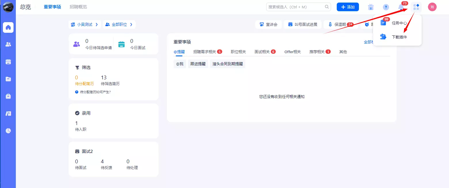 1、登录Moka招聘管理系统,点击右上角的 拼图 图标并选择“下载插件”