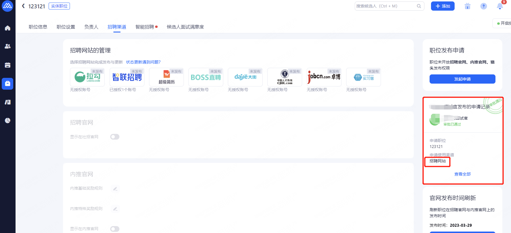 是指在开启“使用职位发布申请”并勾选对应的渠道之后,没有渠道发布权限的HR/管理员创建的职位,需要进行申请并由相关人员审批后才能进行渠道的操作