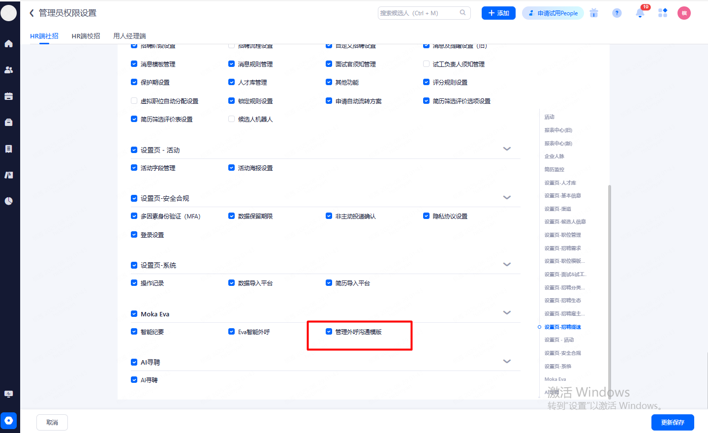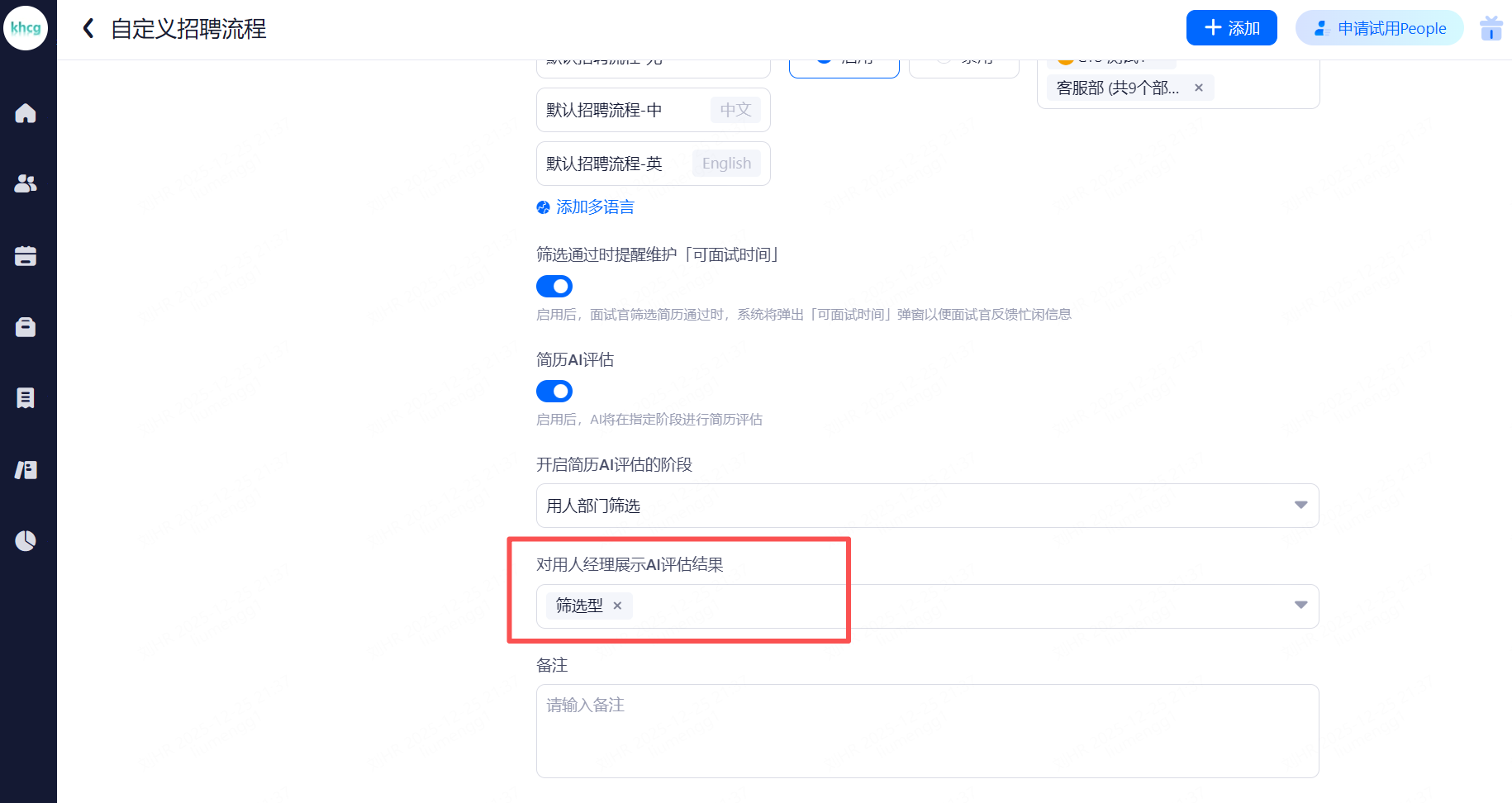 用人经理端,需要在招聘流程中设置“对用人经理展示AI评估结果“的阶段类型,用人经理端才可以在简历处于该类型阶段时展示ai评估结果,比如设置对用人经理展示AI评估结果选择”筛选型“,那么简历处于”筛选型“的阶段时,用人经理端可以查看,若是处理面试型,则无法看到AI评估结果: