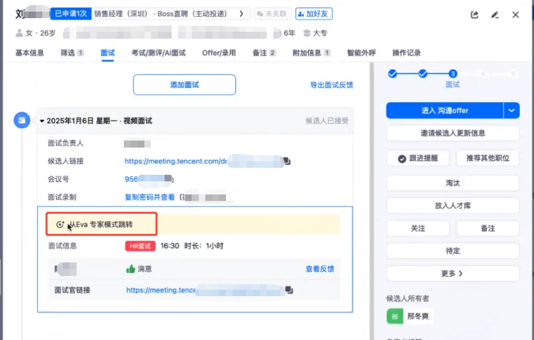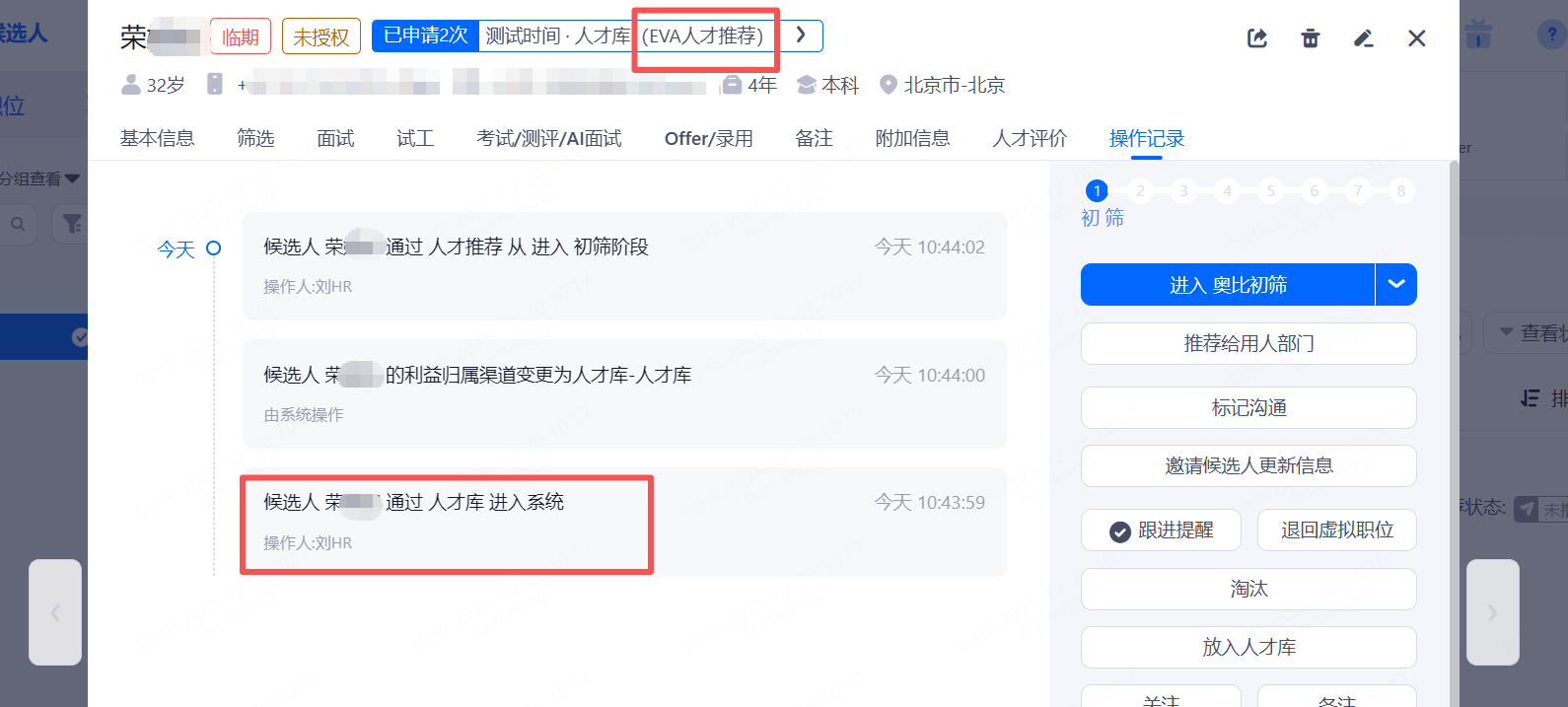 二、通过人才推荐操作进入流程的简历,来源渠道被记录为“Eva人才推荐”