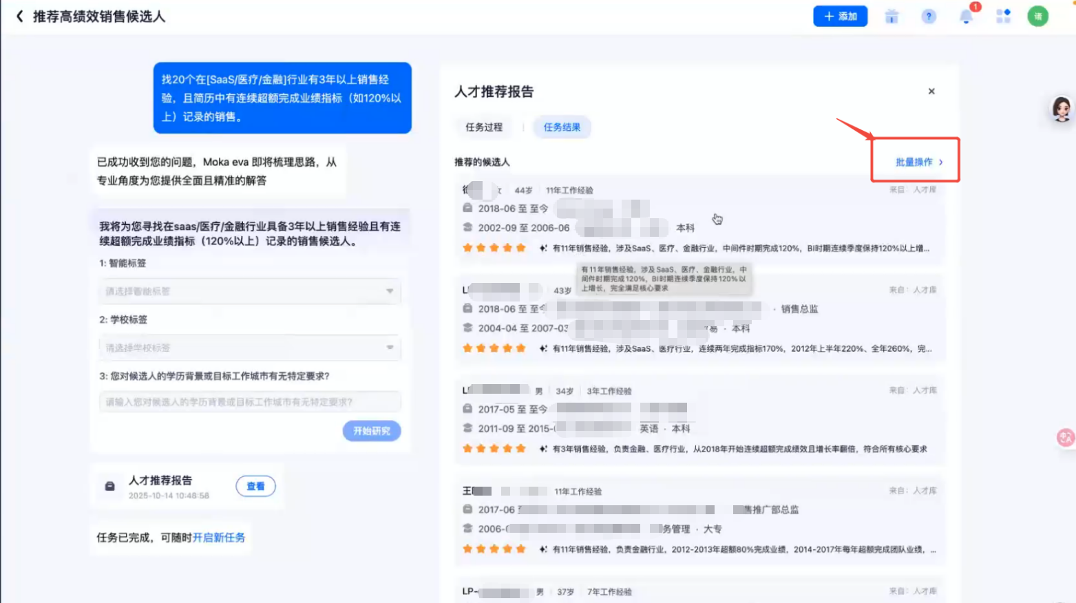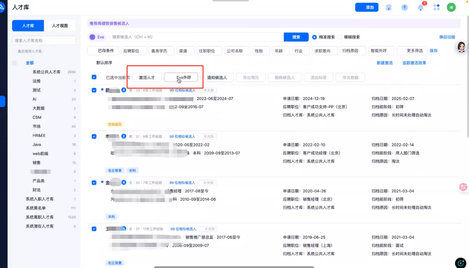 分析完毕之后 可以点击批量操作的按钮 跳转到人才库界面 进行 激活候选人 等功能