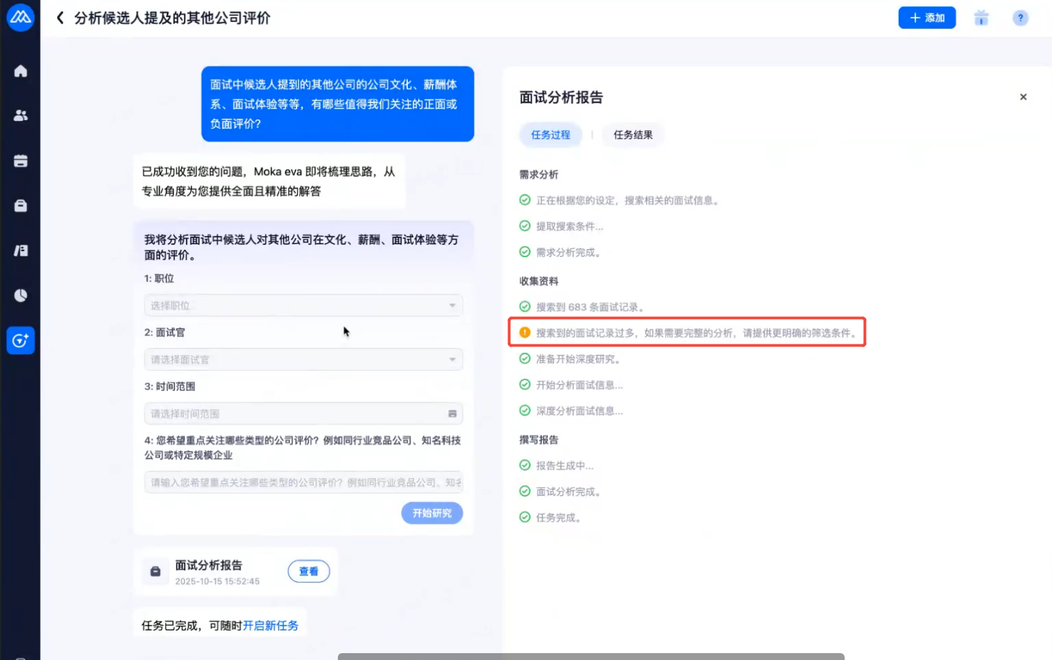 如果面试纪要数据较多 会提示 请提供更明确的筛选条件 以进行分析