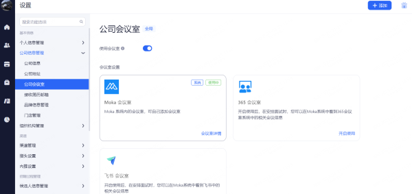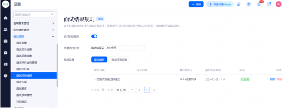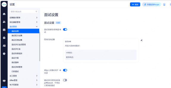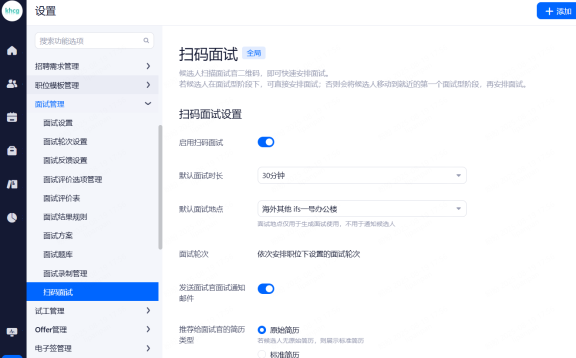 可以通过开关,控制是否使用选定的会议室,同一个地址可添加多个会议室。开启后,在安排现场面试时,可选择会议室。