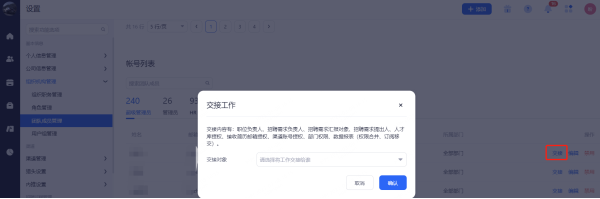 工作交接:当用户的权限发生改变时可通过此功能快速更换权限。