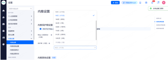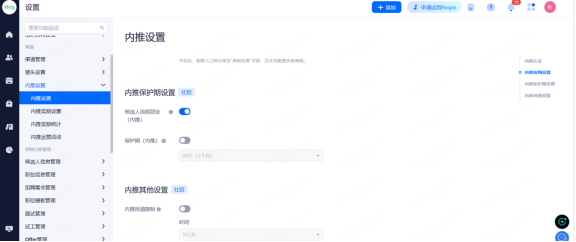 利益所属渠道保护期:开启后,候选人详情页讲展示"利益所属渠道"字段,并且可设置非利益渠道归属保护期。系统会在创建申请、重新分配职位、入职时,根据保护期更新利益所属渠道。