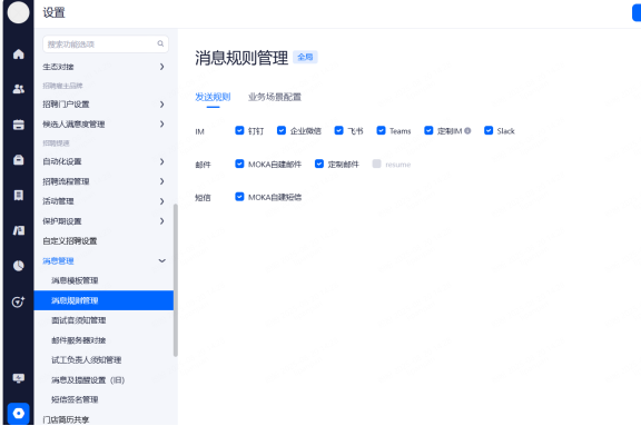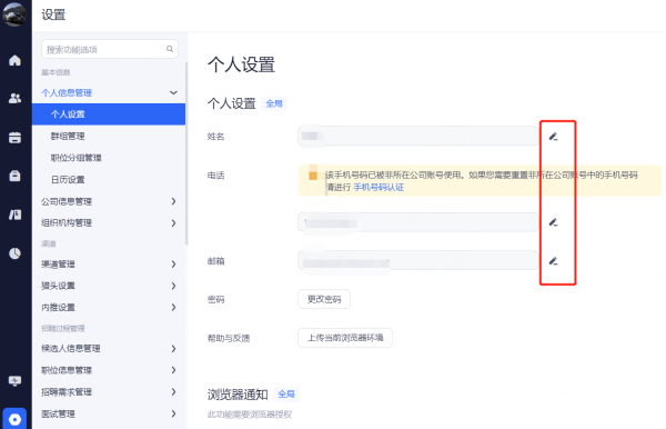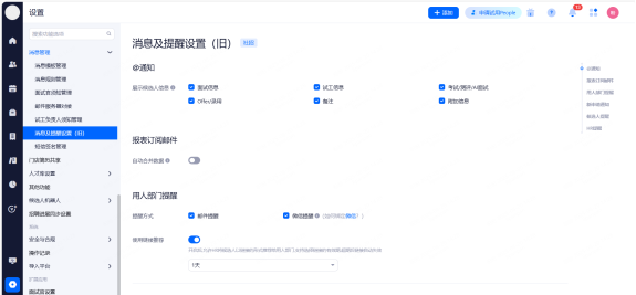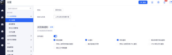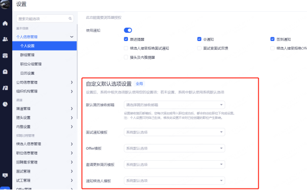 浏览器通知:设置整个招聘过程中,web端页面的通知提醒。勾选相应的功能后当通知提醒触发时,系统通过当时登录的浏览器进行web提醒。