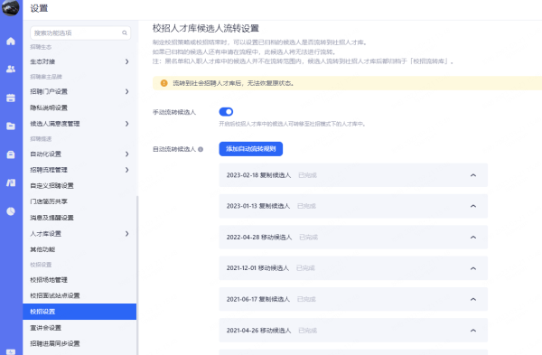 自动流转候选人:选择符合条件的候选人在设定时间自动转移至社招人才库。