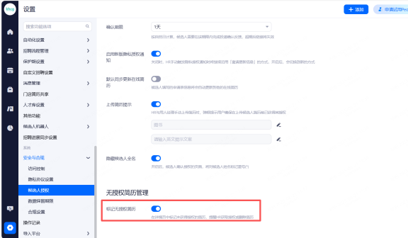无授权的简历进行标记,提醒HR获取授权或删除简历