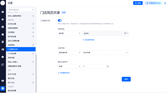 开启门店简历共享,系统将每天 0 点自动查询符合当前共享规则的候选人共享到附近门店。