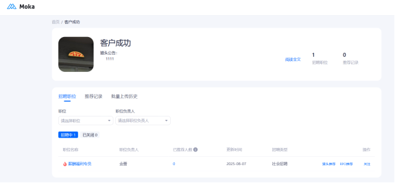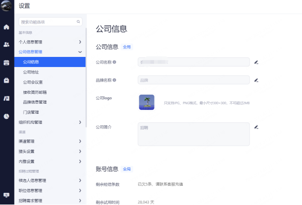 维护公司名称、logo、简介等信息;同时,在该界面也会显示公司的账号使用情况、剩余短信条数以及Moka视频面试余额。
