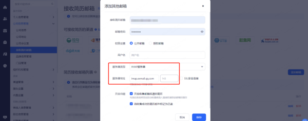 用于系统接收招聘渠道后续投递进来的简历(如有BOSS渠道的简历,需要填写简历接收邮箱)。添加邮箱时需选择邮箱的权限设置类型: