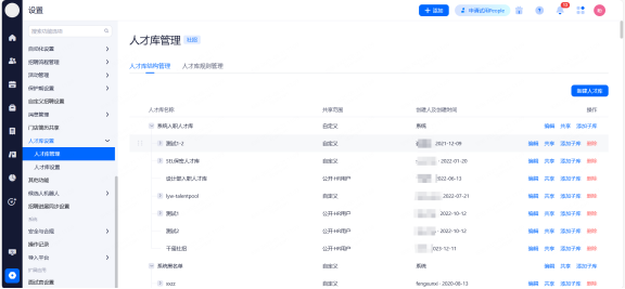 授权用户:支持按部门、角色、账号授权给相应用户的查看权限。系统公共、入职、离职、黑名单人才库只有超级管员能设置私密、下级人才库。