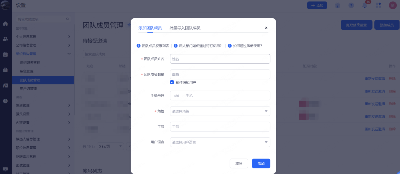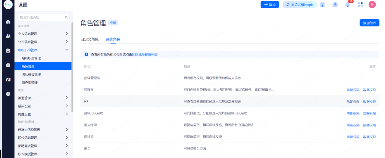 管理员:可查看部门内有权限的职位,以及职位下相关候选人,可管理部门内的团队成员(一般是分公司或事业部的HR主管)