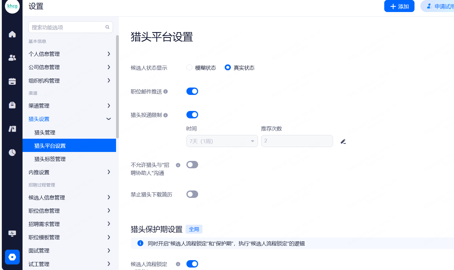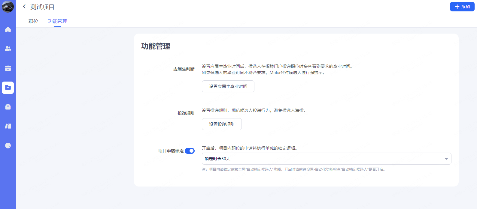 项目申请锁定:职位的锁定候选人功能以项目设置的为准,项目申请锁定的前提是需要开启全局的自动锁定候选人功能