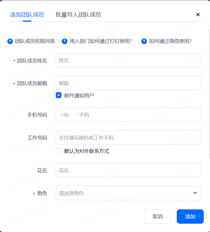 添加团队成员带“*”的内容为必填项