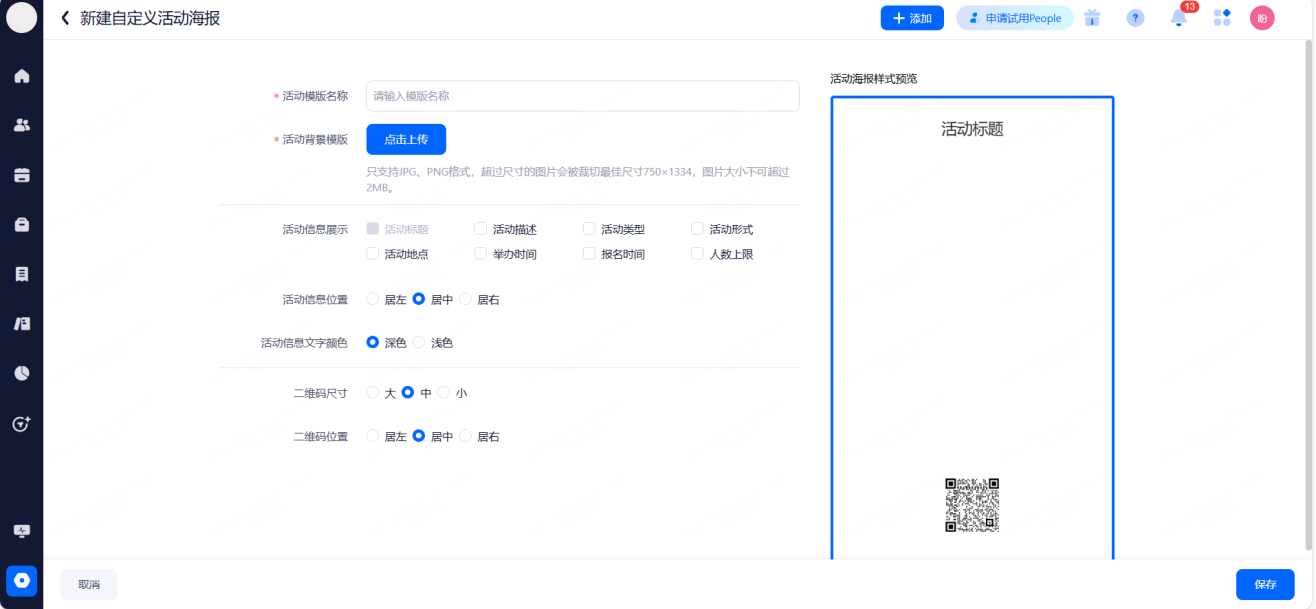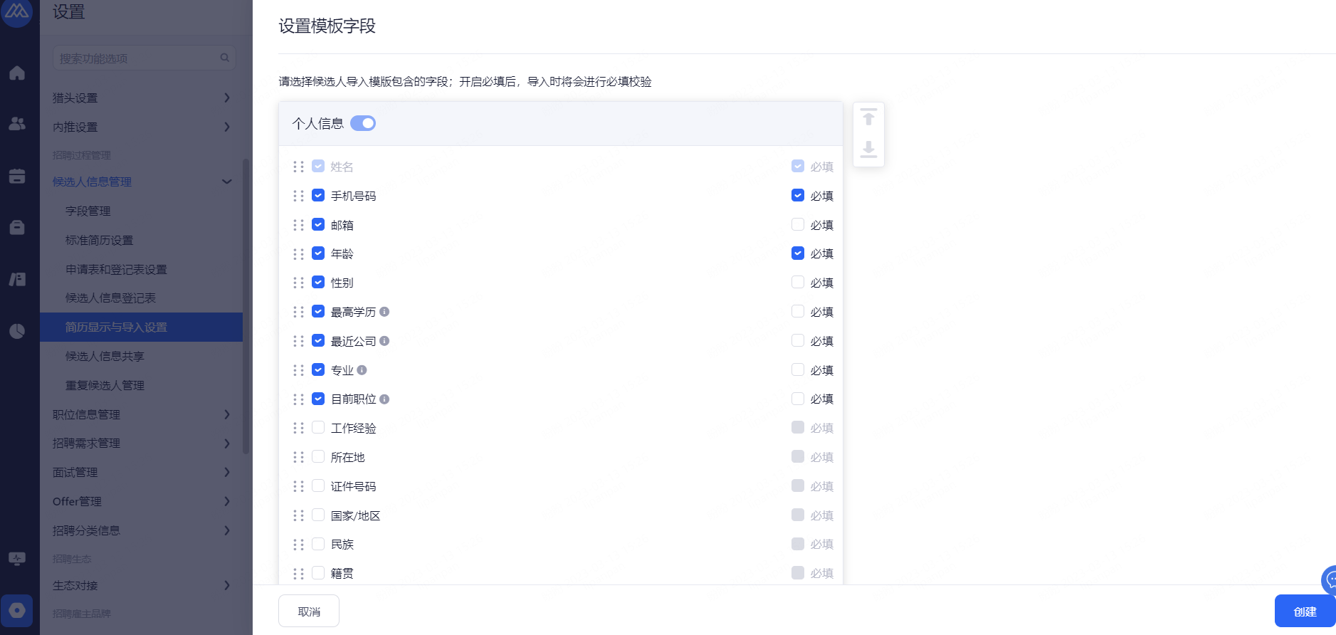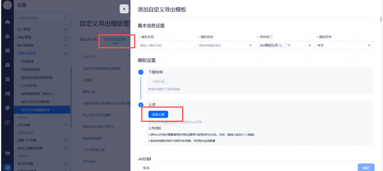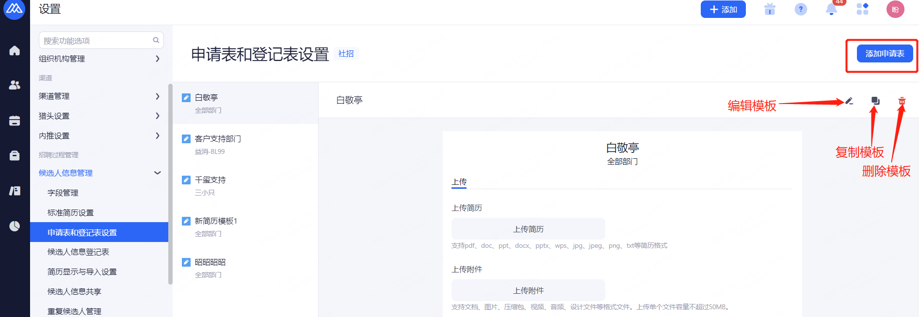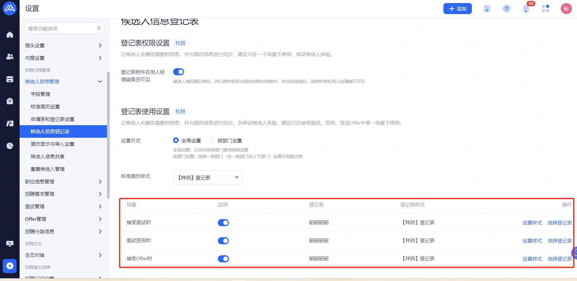 前台登记表设置:开启后前台可打印/下载候选人信息。