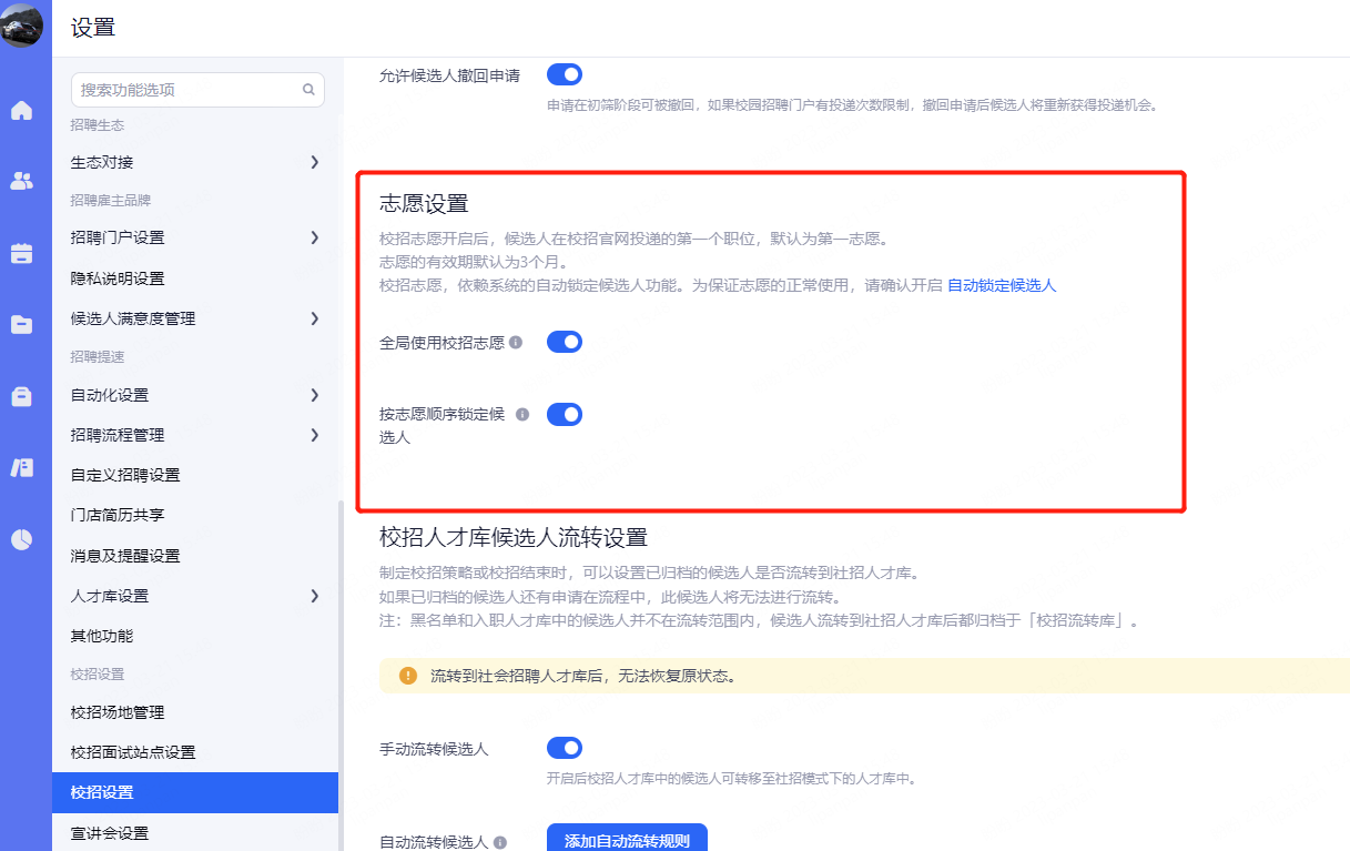 全局使用校招志愿:开启后候选人可设置第一志愿。