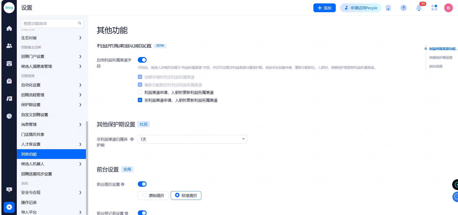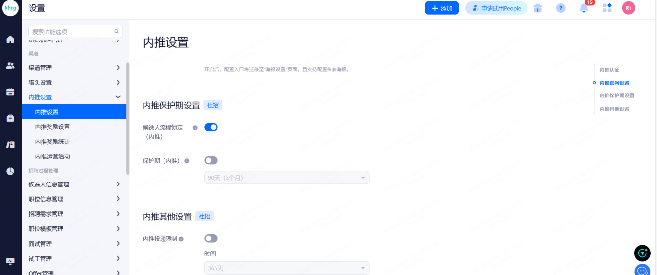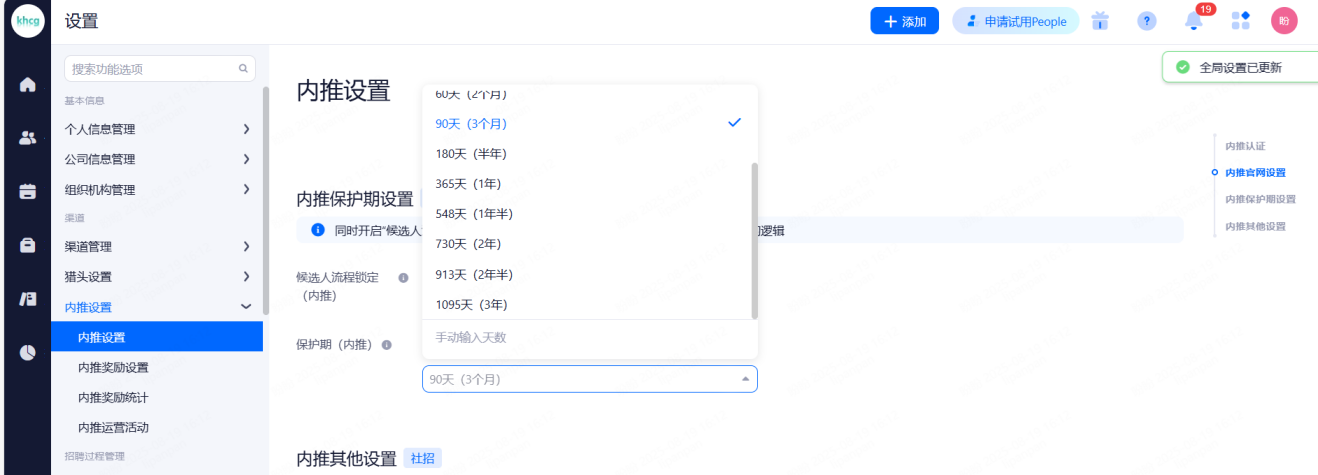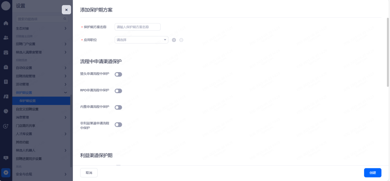 利益所属渠道保护期:开启后,候选人详情页讲展示"利益所属渠道"字段,并且可设置非利益渠道归属保护期。系统会在创建申请、重新分配职位、入职时,根据保护期更新利益所属渠道。
