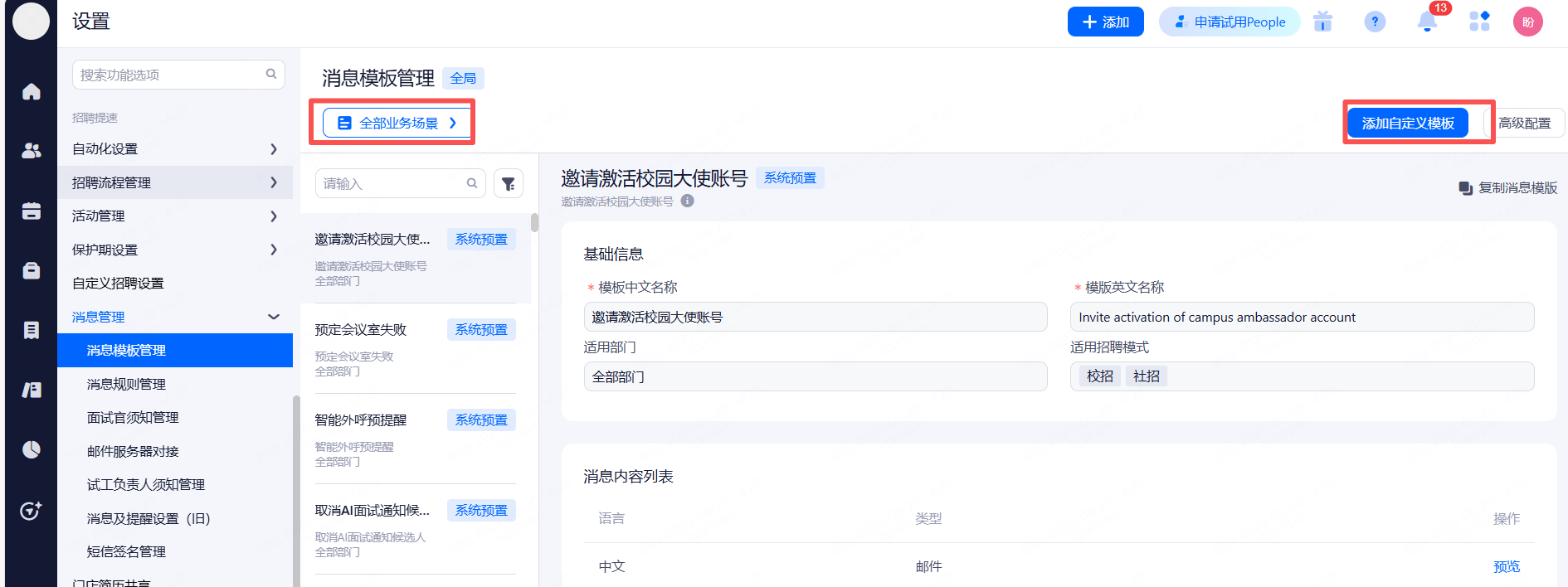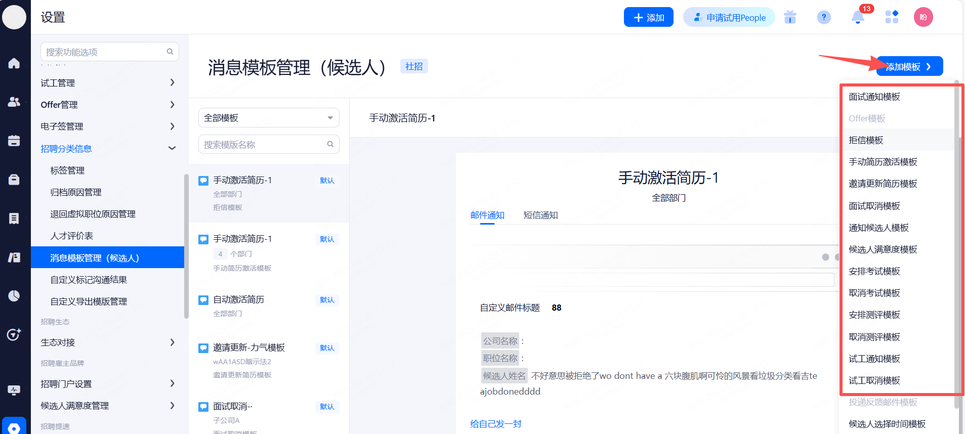 通知候选人模板:招聘分类信息>消息模板管理>通知候选人模板
