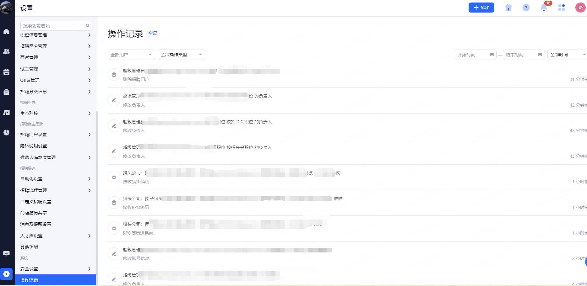 查询用户在某段时间内的操作,在平台上所有的操作记录,只有超级管理员可以看到,其他人员无权限。