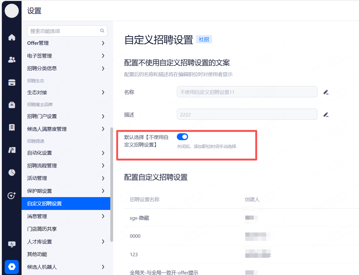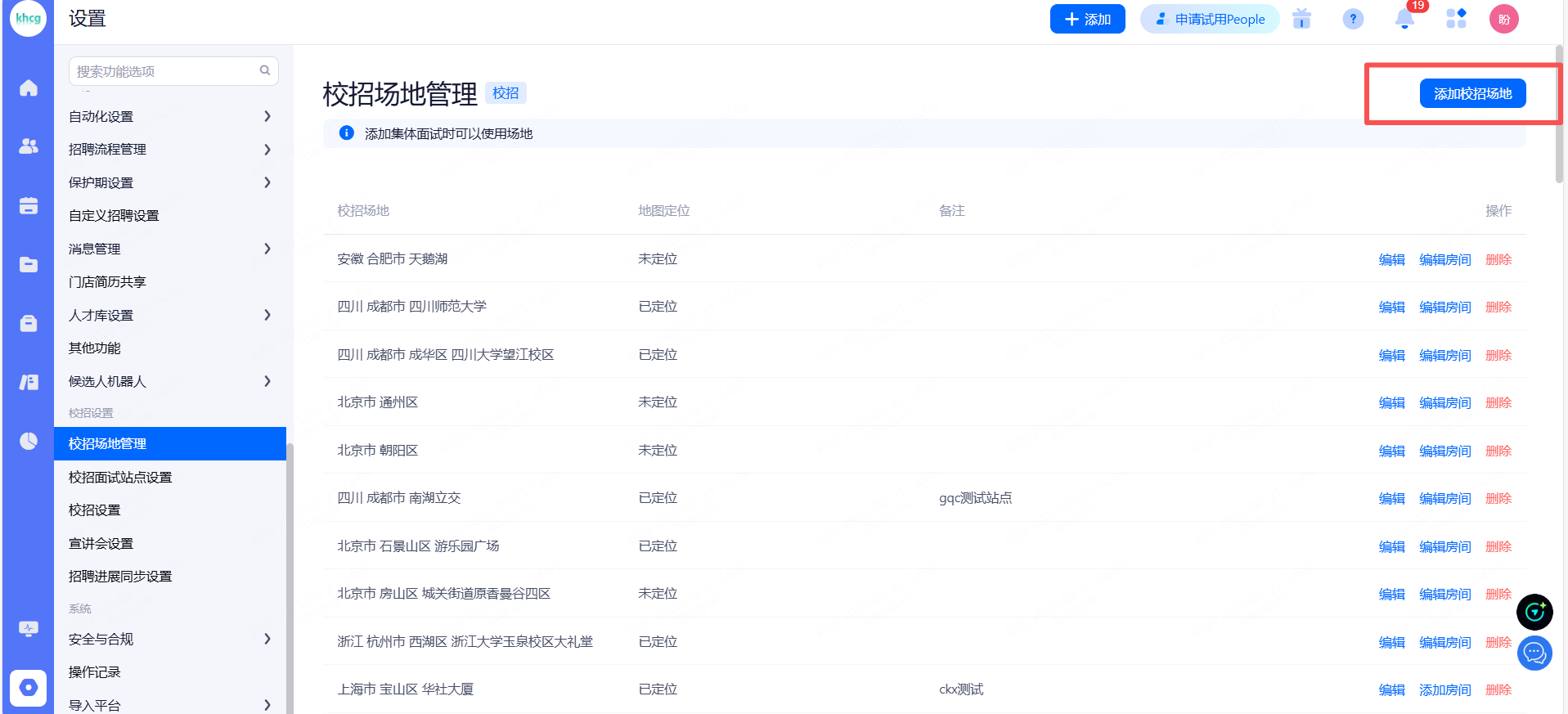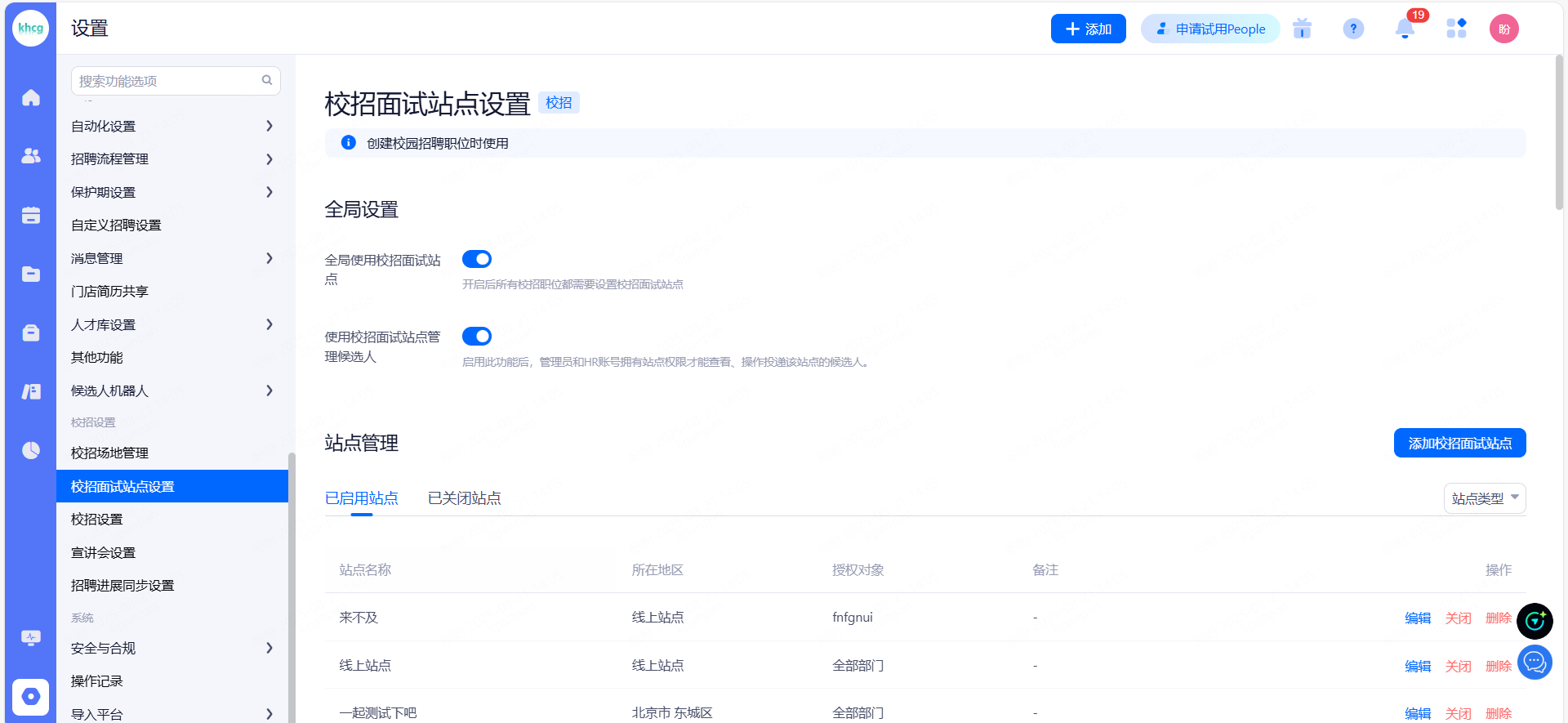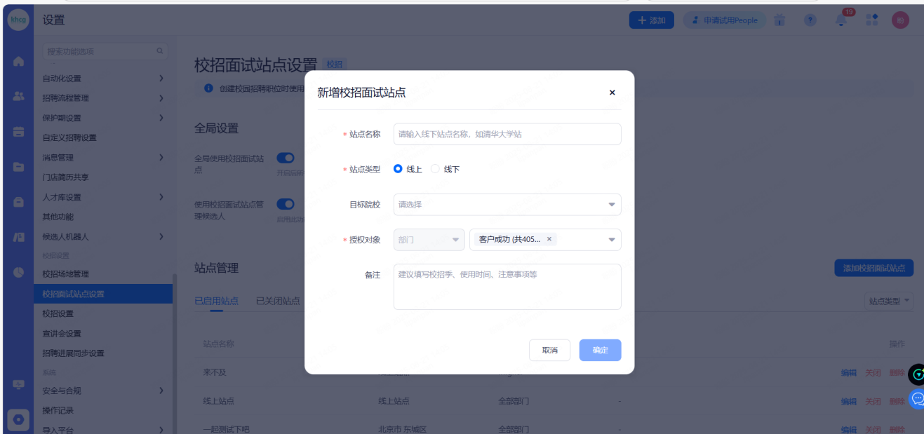 校招面试站点:开启后所有校招职位都需要设置校招面试站点。