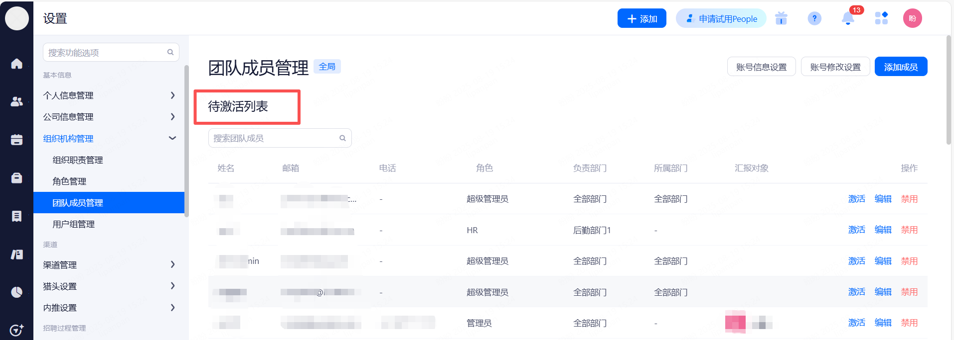超级管理员、高级用人经理、HR角色受邀成员账号激活