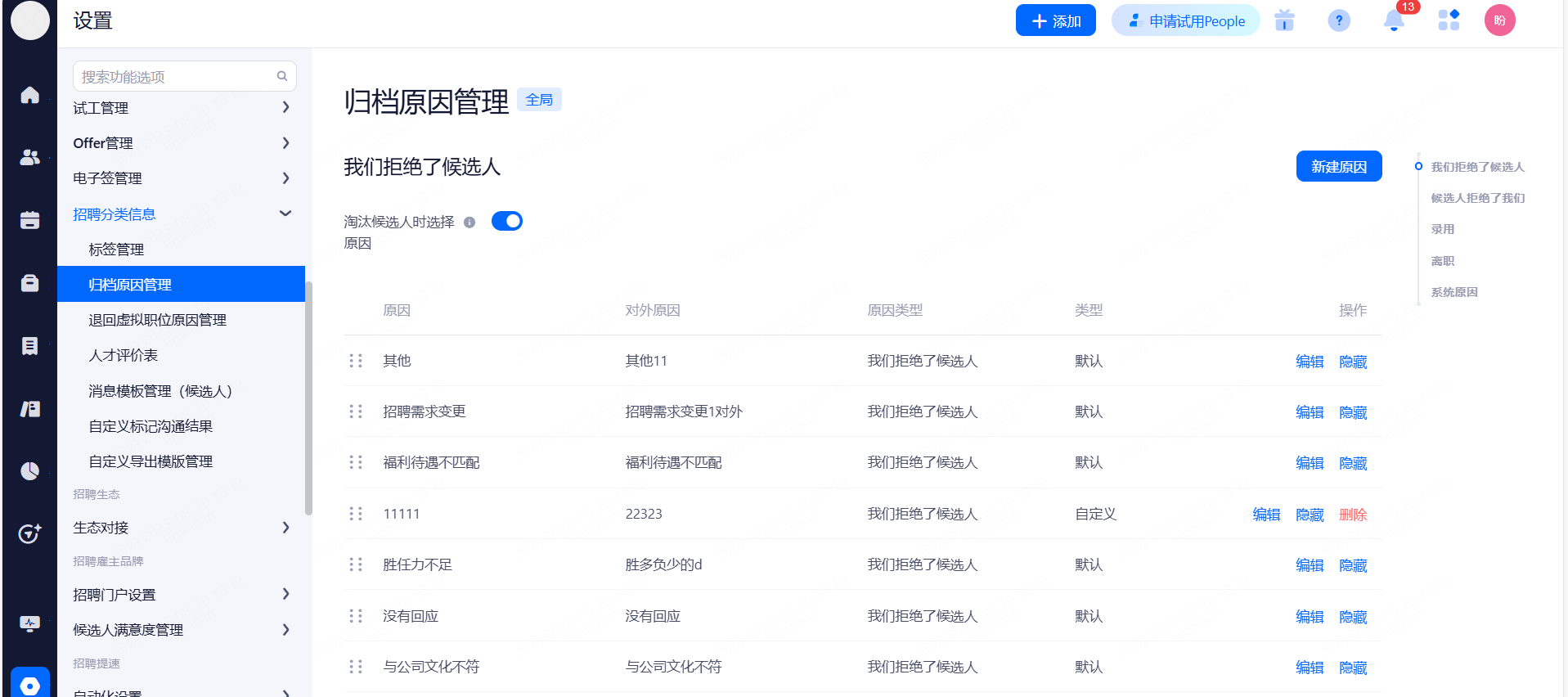 向候选人,校园大使同步招聘进展:阶段类型只对候选人,校园大使生效;候选人归档和淘汰,会对候选人、校园大使和内推人同时生效。
