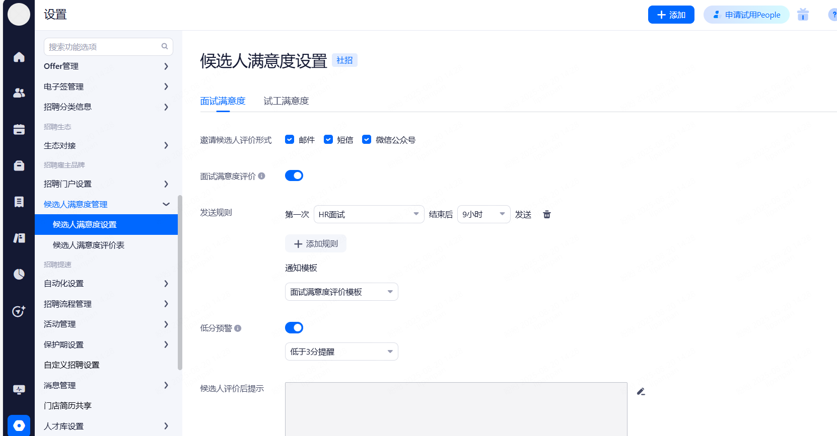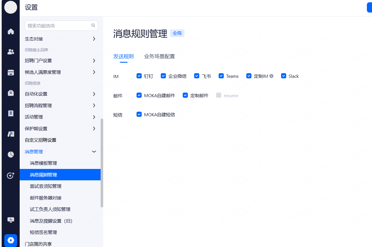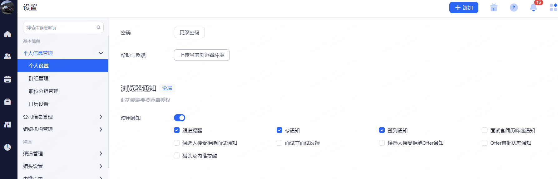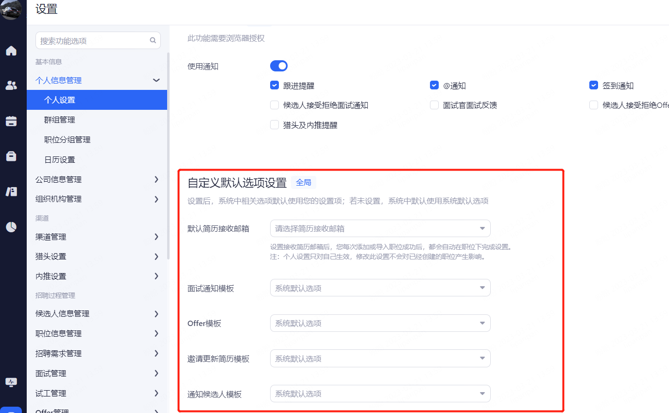 浏览器通知:设置整个招聘过程中,web端页面的通知提醒。勾选相应的功能后当通知提醒触发时,系统通过当时登录的浏览器进行web提醒。