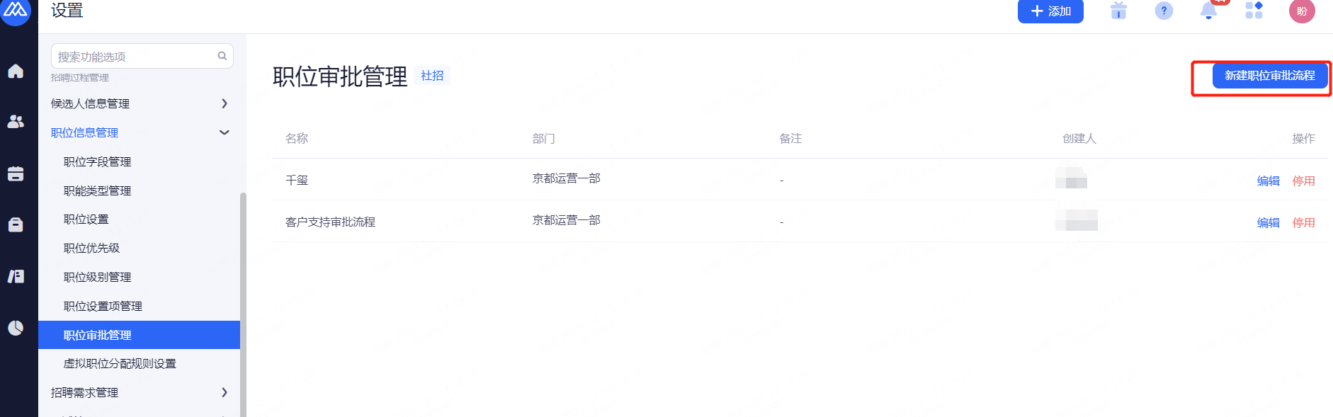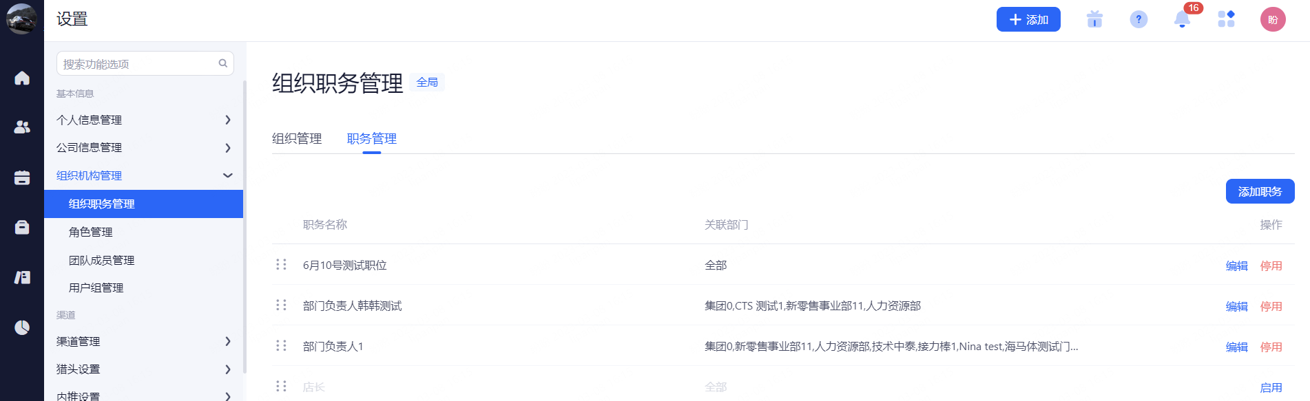 职务管理用于HR按职务区别部门或门店的人员,新增职务类型,新建后需关联至相应部门。