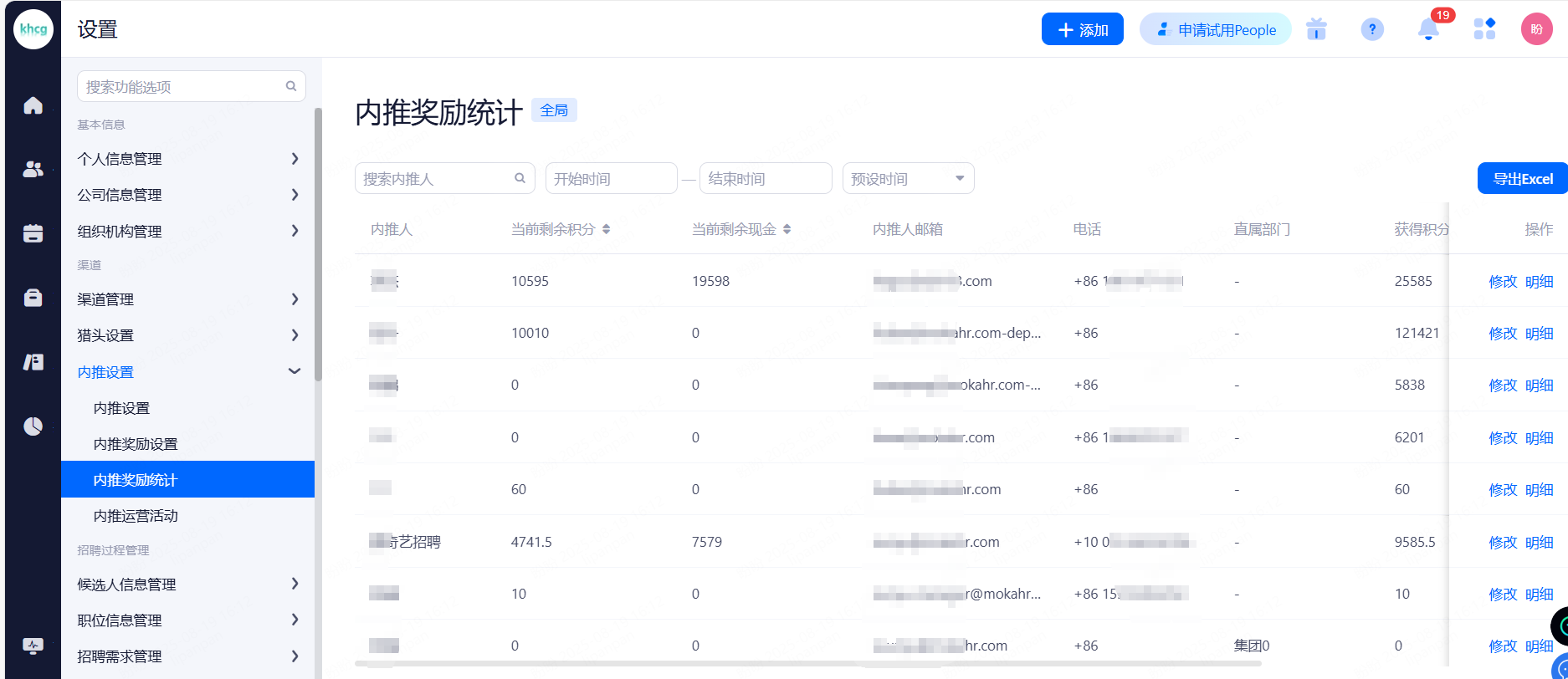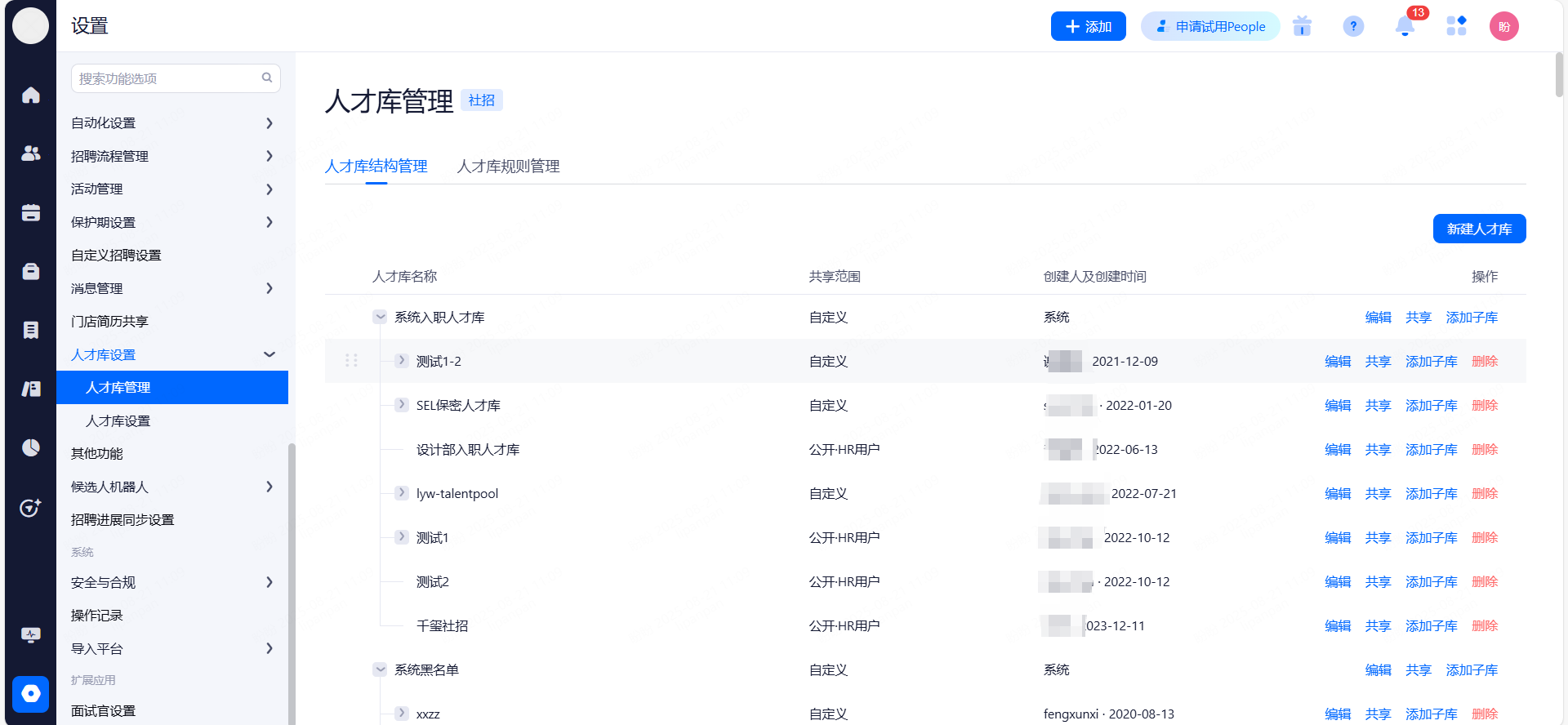 授权用户:支持按部门、角色、账号授权给相应用户的查看权限。系统公共、入职、离职、黑名单人才库只有超级管员能设置私密、下级人才库。