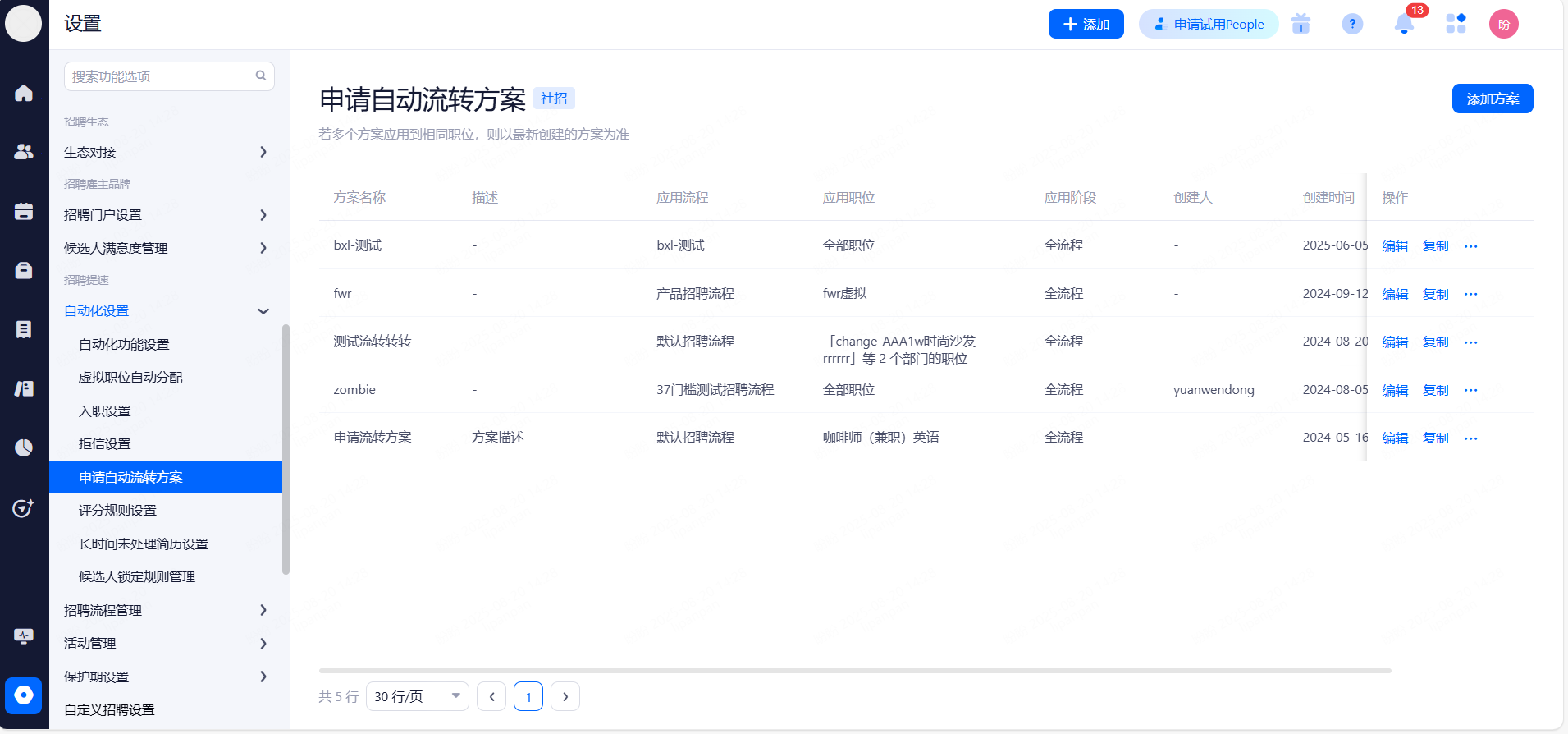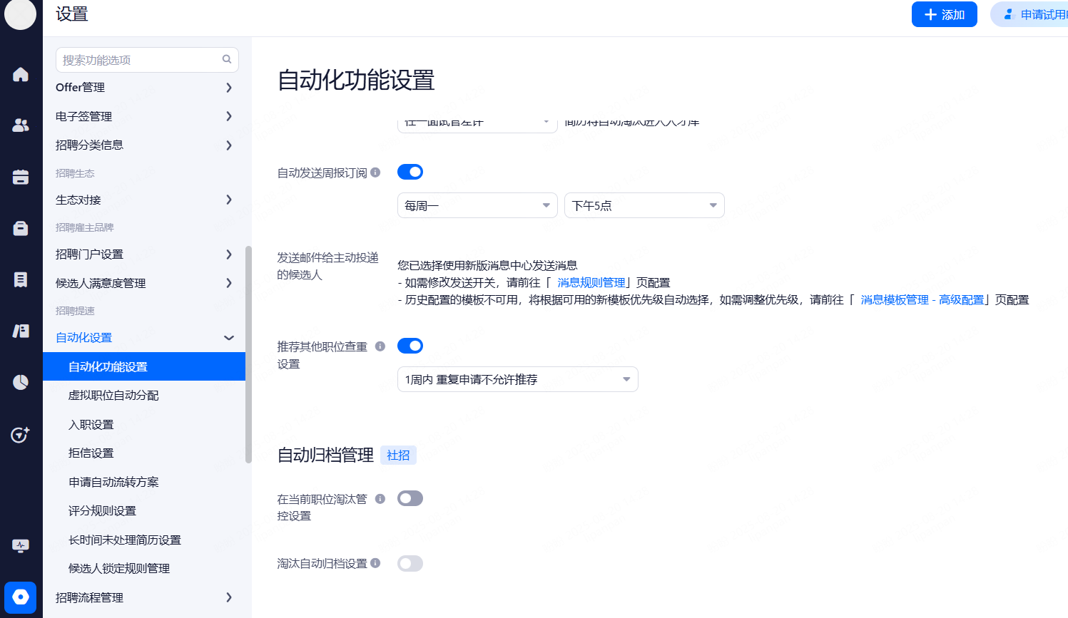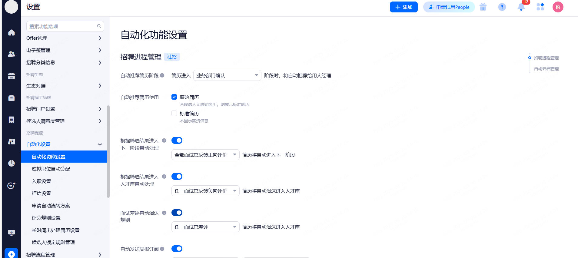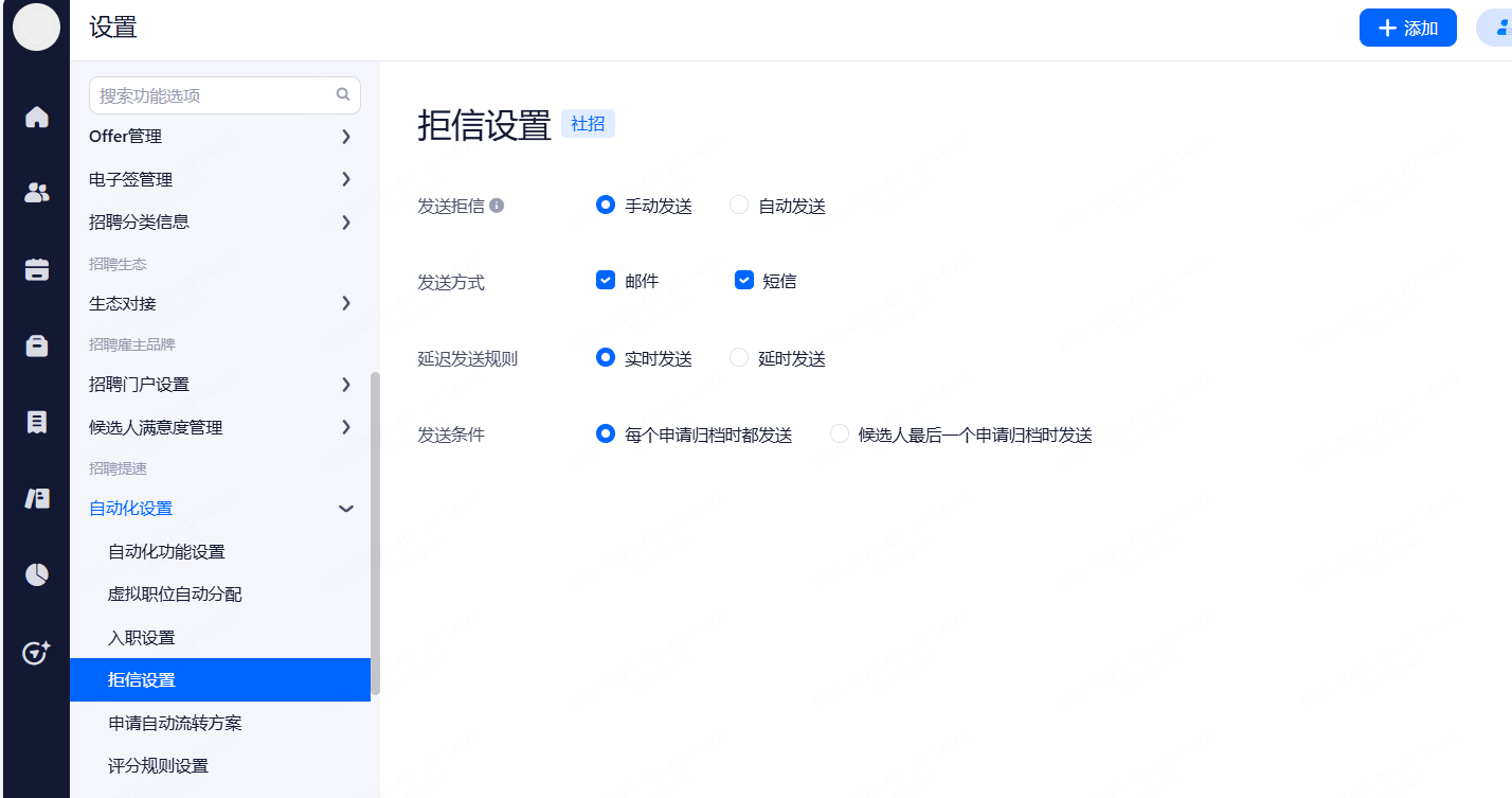自动流转候选人:选择符合条件的候选人在设定时间自动转移至社招人才库。