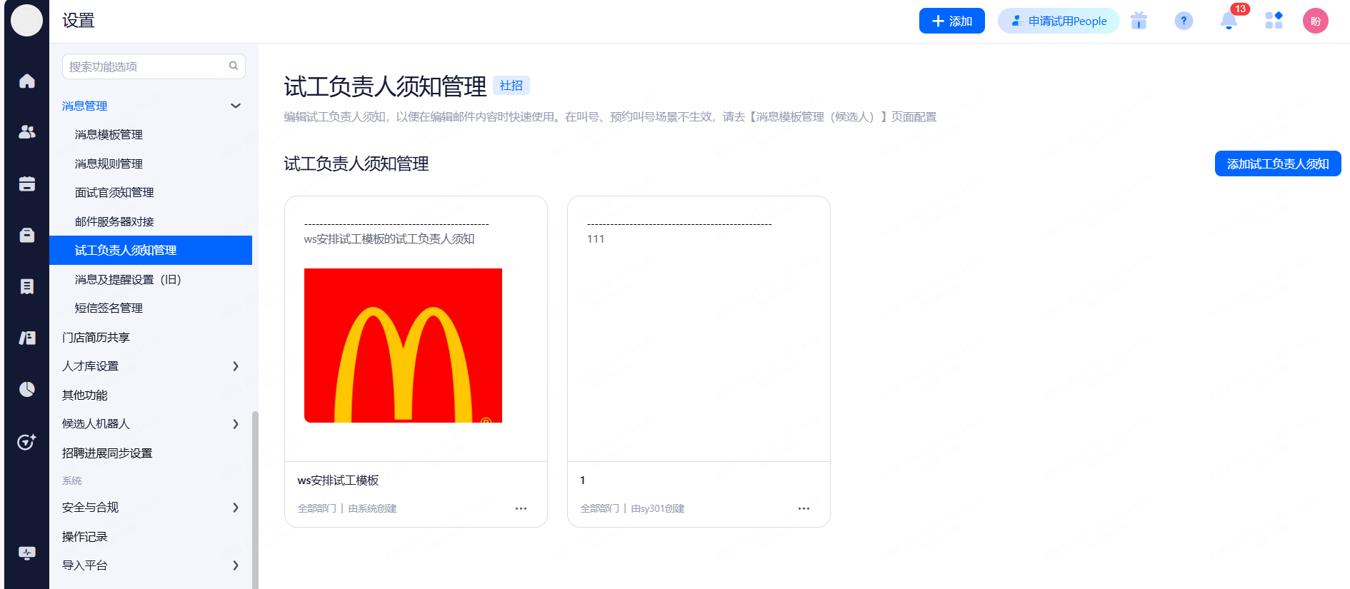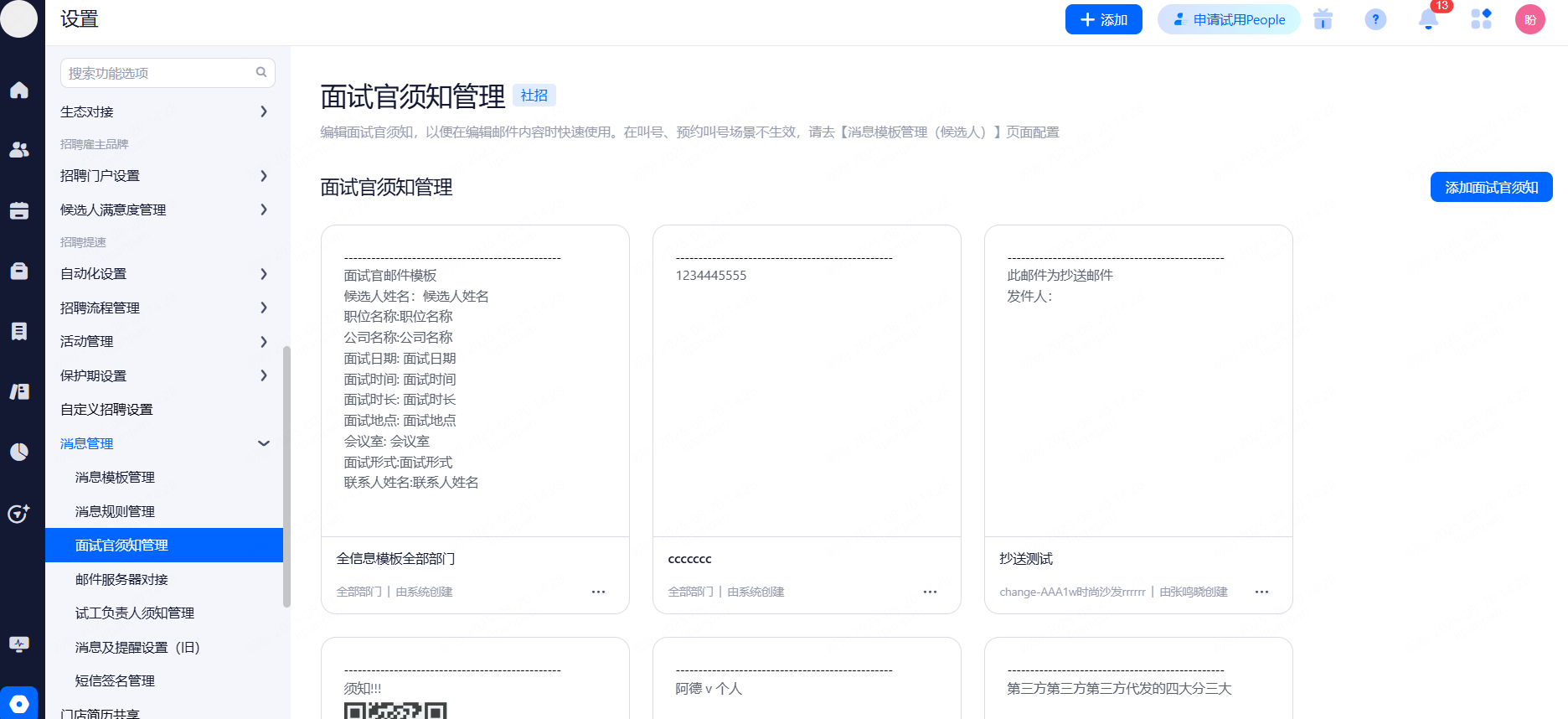 面试通知模板:招聘分类信息>消息模板管理>面试通知模板