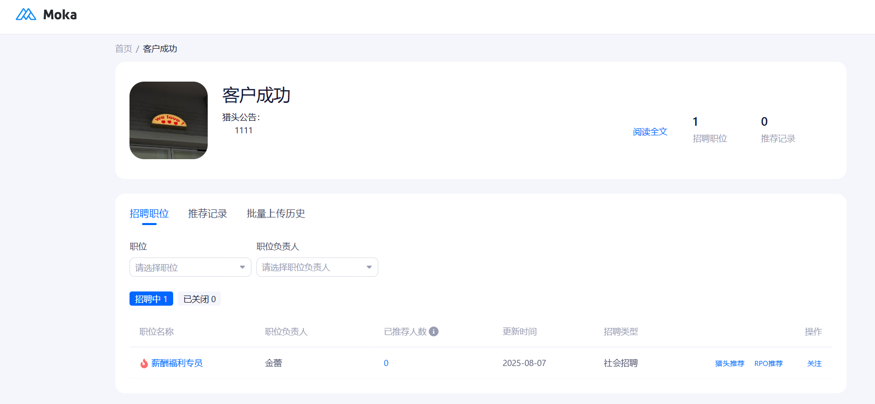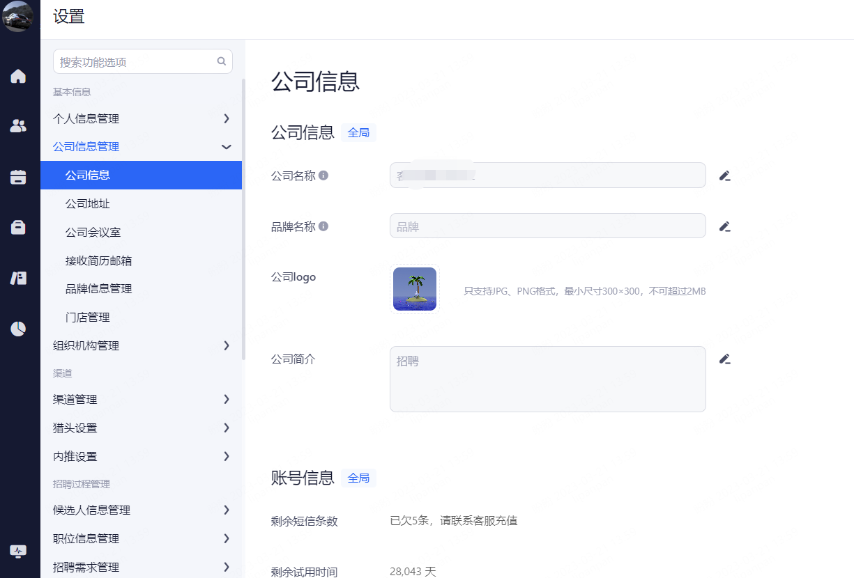 维护公司名称、logo、简介等信息;同时,在该界面也会显示公司的账号使用情况、剩余短信条数以及Moka视频面试余额。