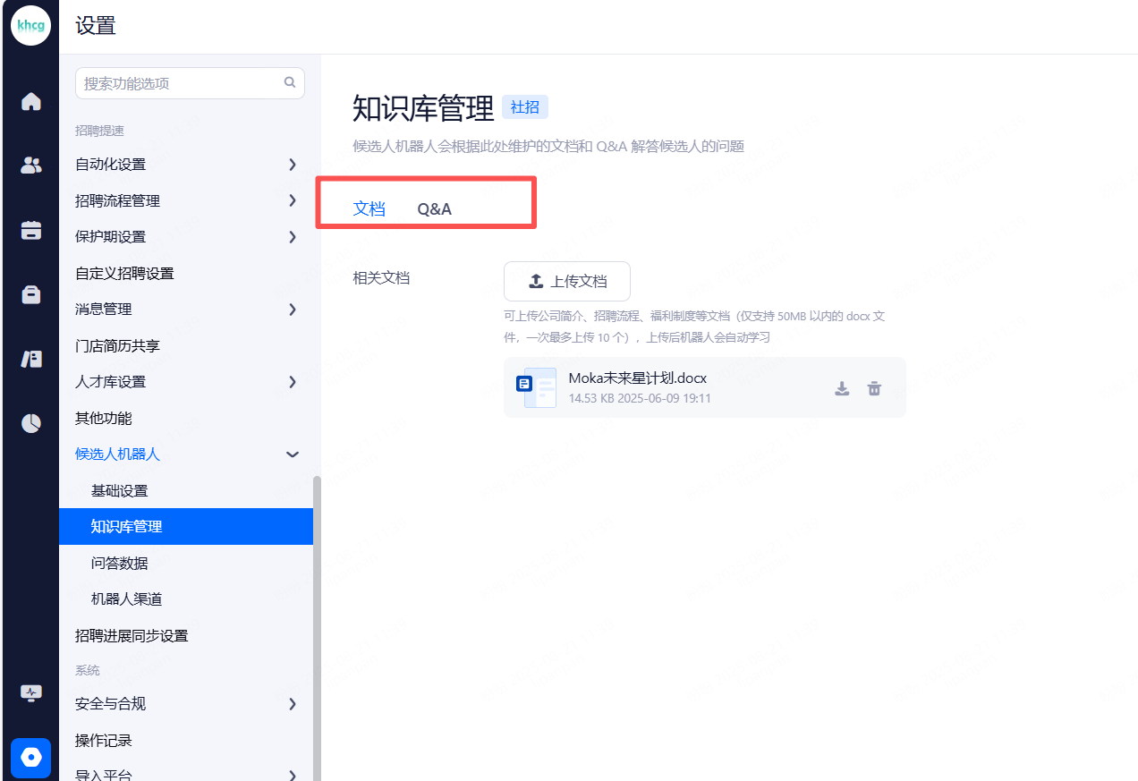 此处维护文档以及Q&A,候选人机器人会根据维护的内容解答候选人的问题