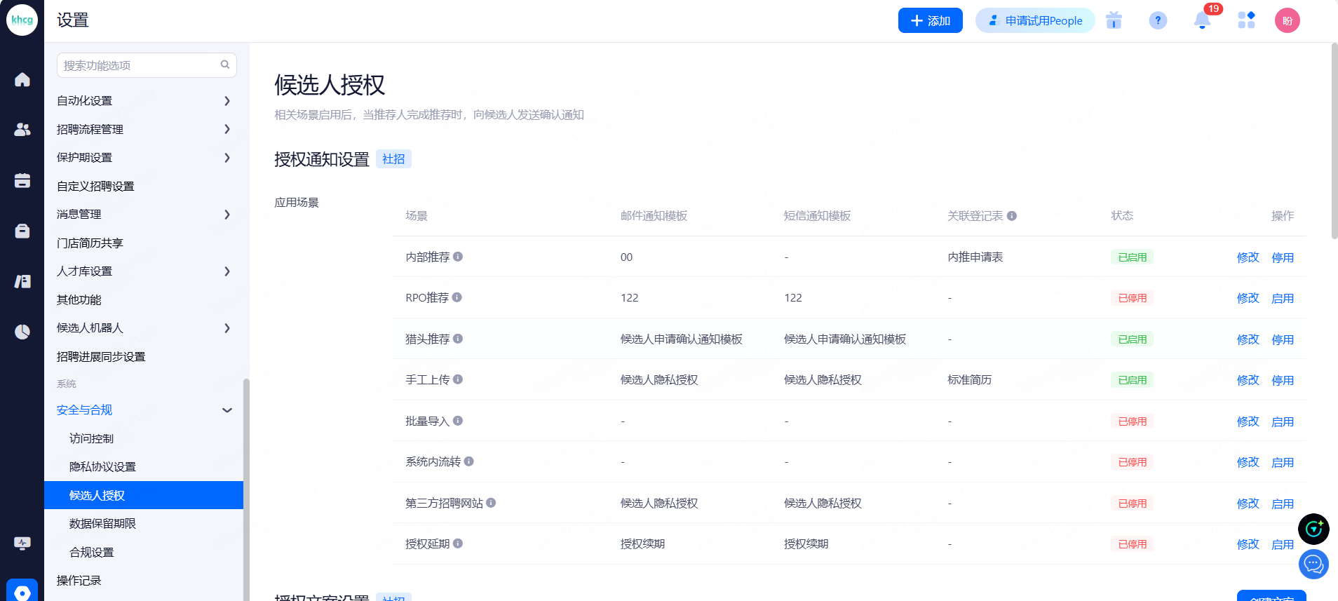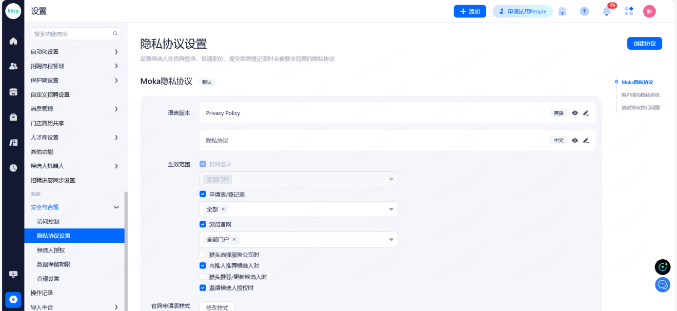 设置候选人在官网登录、投递职位、提交信息登记表时被要求同意的隐私协议