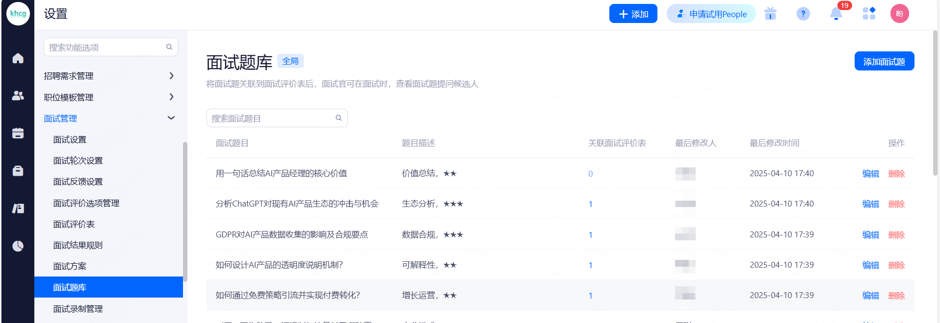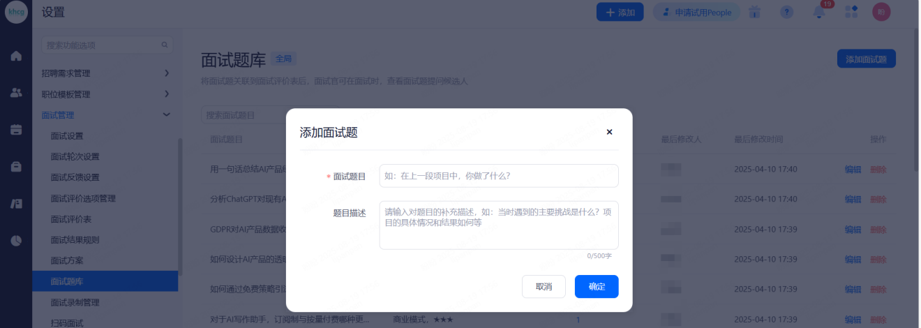 面试官:可添加候选人、筛选简历、填写面试反馈以及查看所有的面试反馈(一般是用人部门主管)、Offer审批、数据报表、人才库