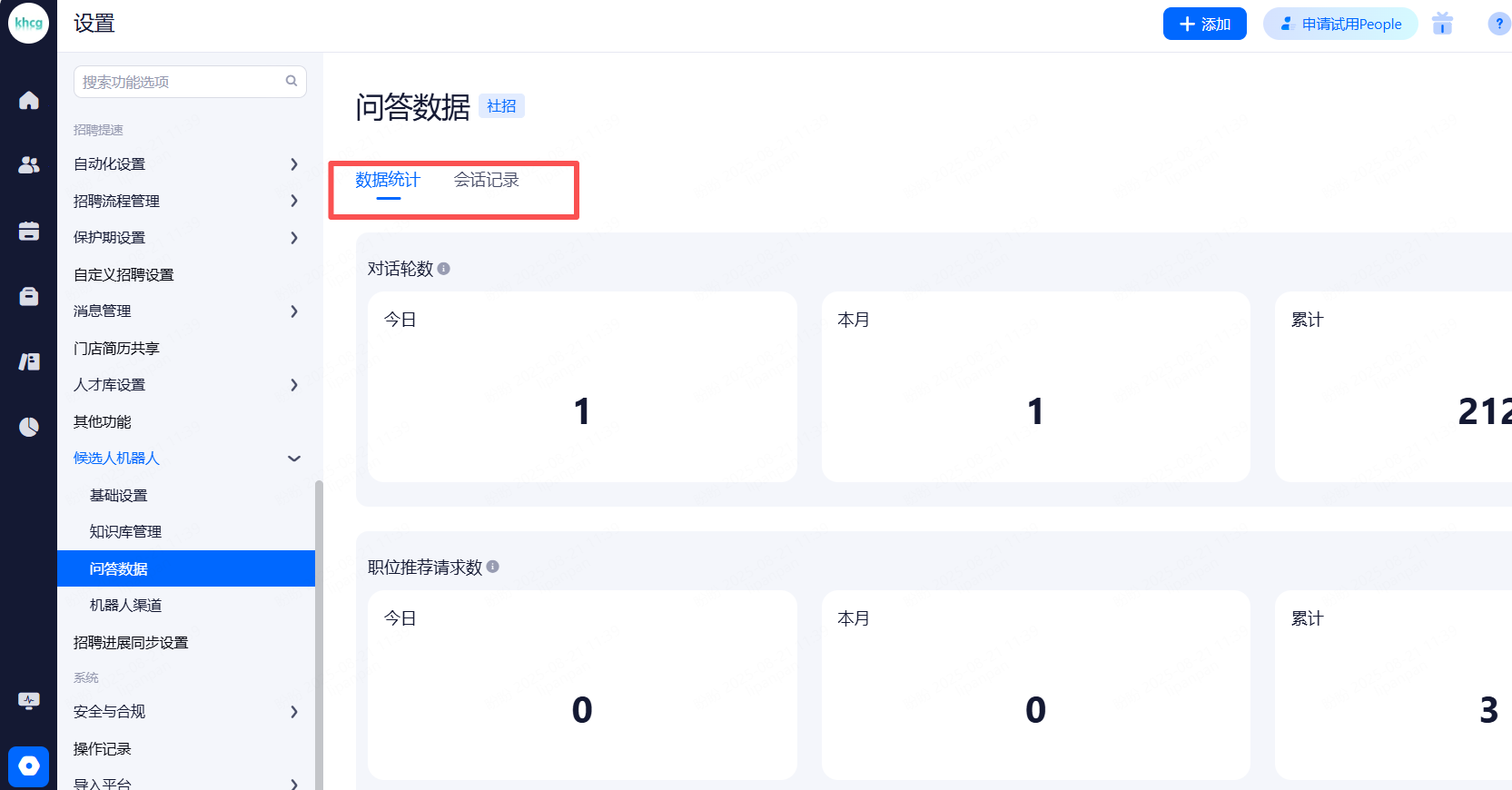 可查看数据统计以及会话记录
