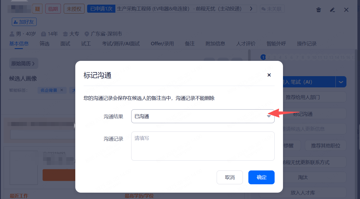 允许候选人撤回申请:在进行「推荐给用人部门」、「移动到其他阶段」、「分配职位」、「淘汰」、「放入人才库」操作后,候选人皆不能进行撤回操作。