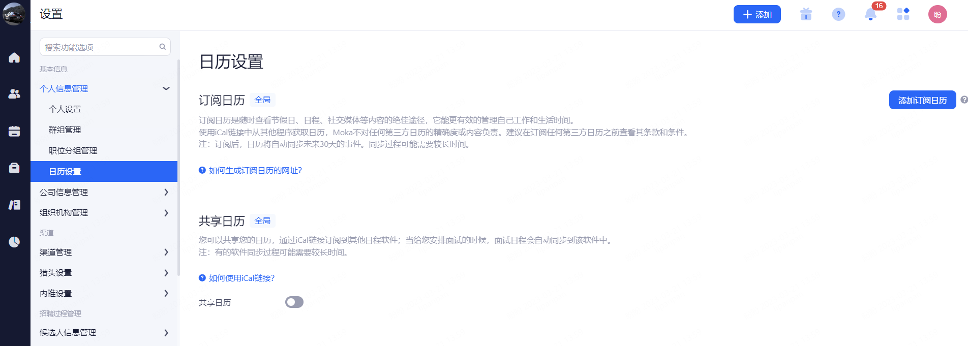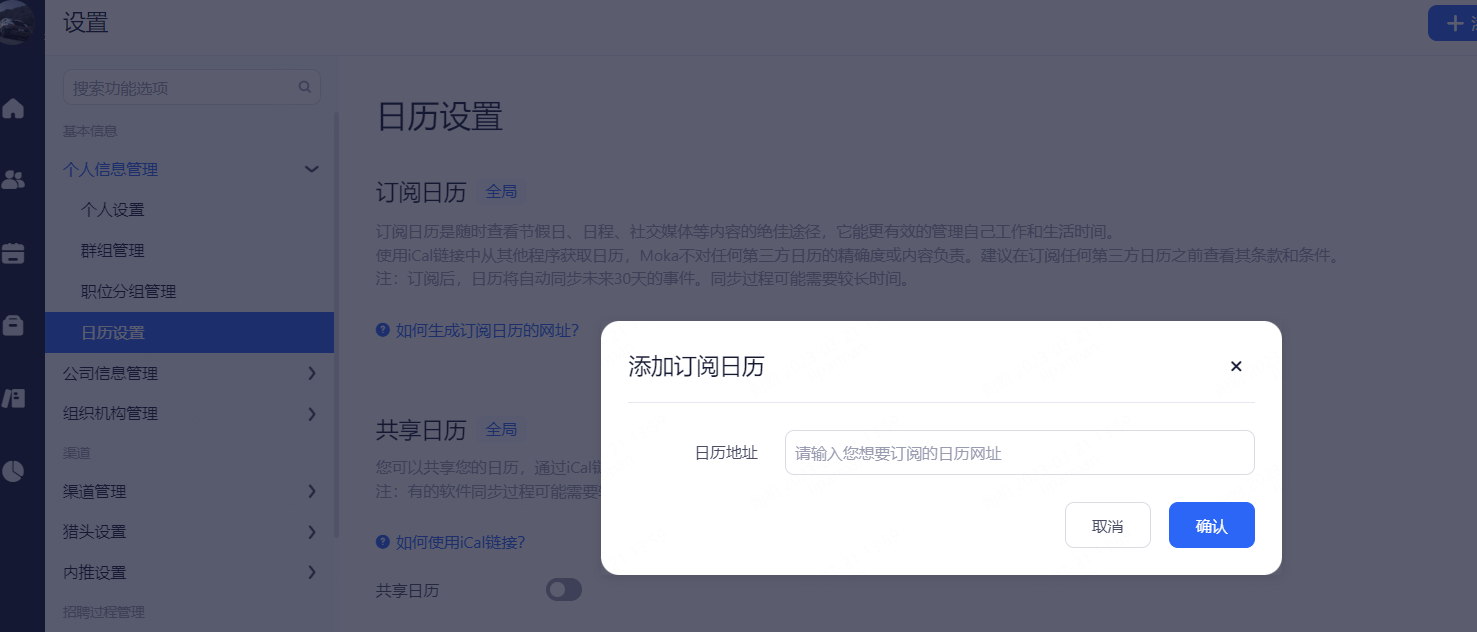 订阅日历:将其他日程管理工具通过其iCal链接将个人的日程安排,添加到Moka系统中进行合并,更有效地管理自己工作和生活时间。