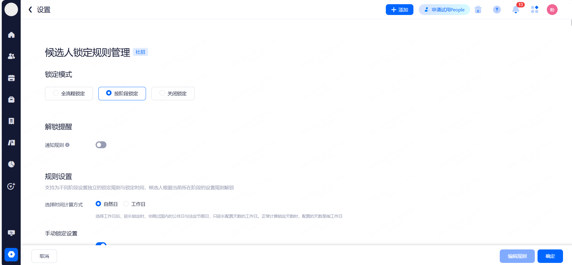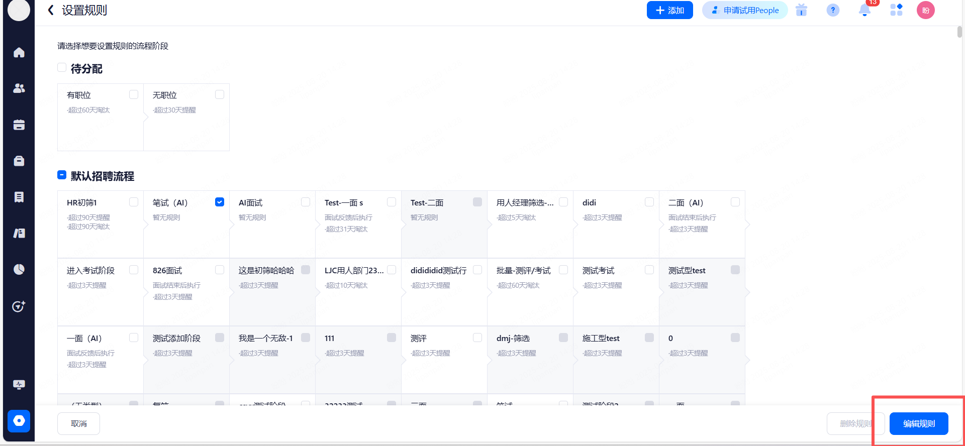 支持触发的阶段不含Offer类型、待入职类型;申请在指定类型的的阶段中停留达到指定天数;阶段停留时间单位为自然天。