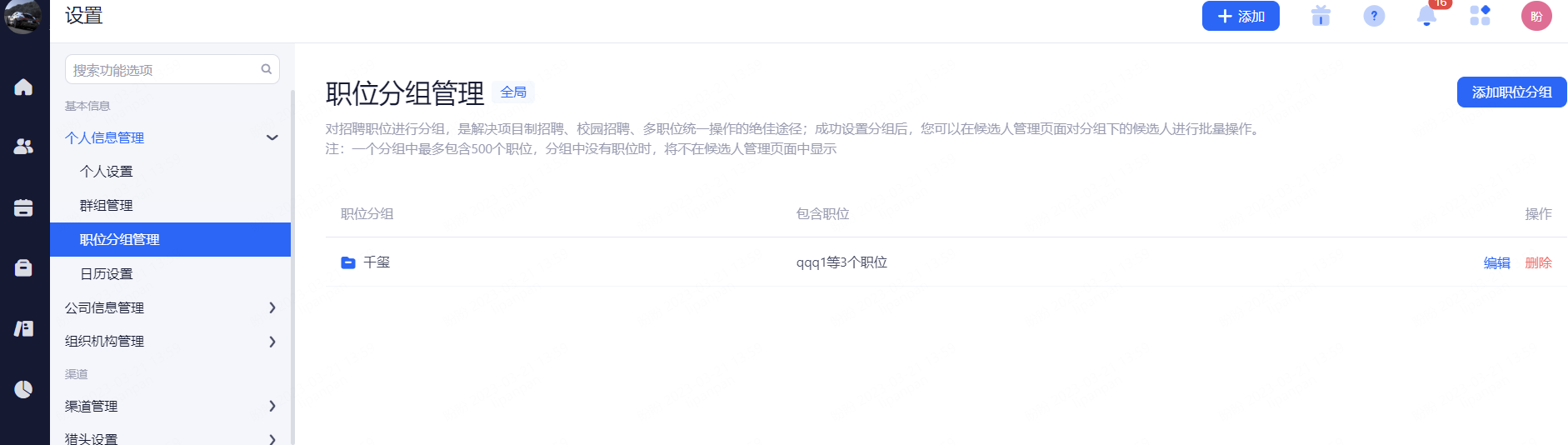 注:一个分组中最多包含500个职位,分组中没有职位时,将不在候选人管理页面中显示