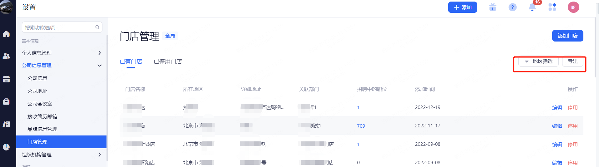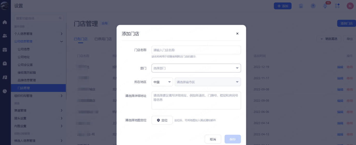 该功能适用于具有多个门店公司,可以在此对自己旗下门店进行统一规范化管理。可以关联招聘职位,入职面试邮件可显示该门店地址和定位信息。