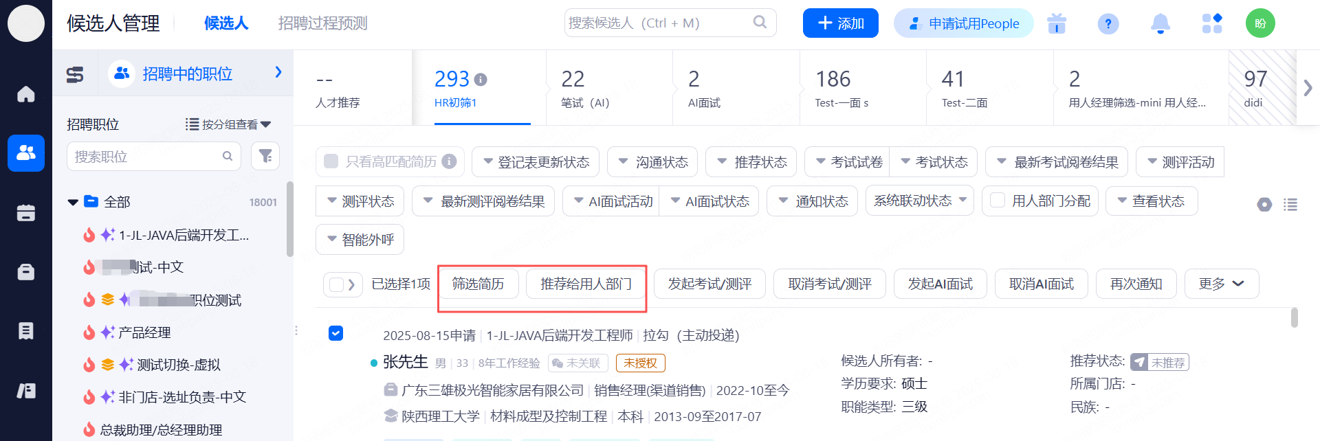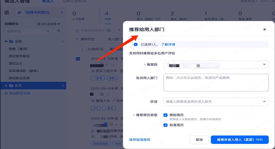 hr手动移动到用人部门阶段,或者是推荐给业务部门筛选通过的候选人