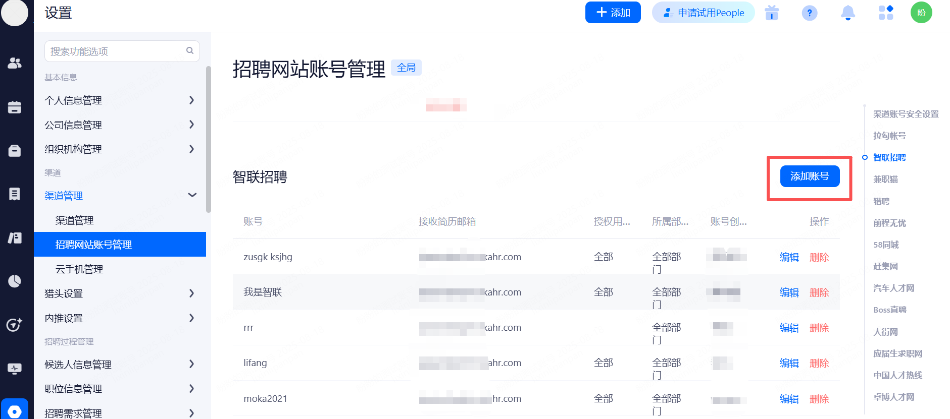 绑定渠道网站帐号作用:发布职位、更新或下架时,不需要每次重复录入渠道帐号的帐号名称和密码。发布职位时,可将渠道对应帐号信息带入到登录页面并跳转到渠道内职位信息页面。