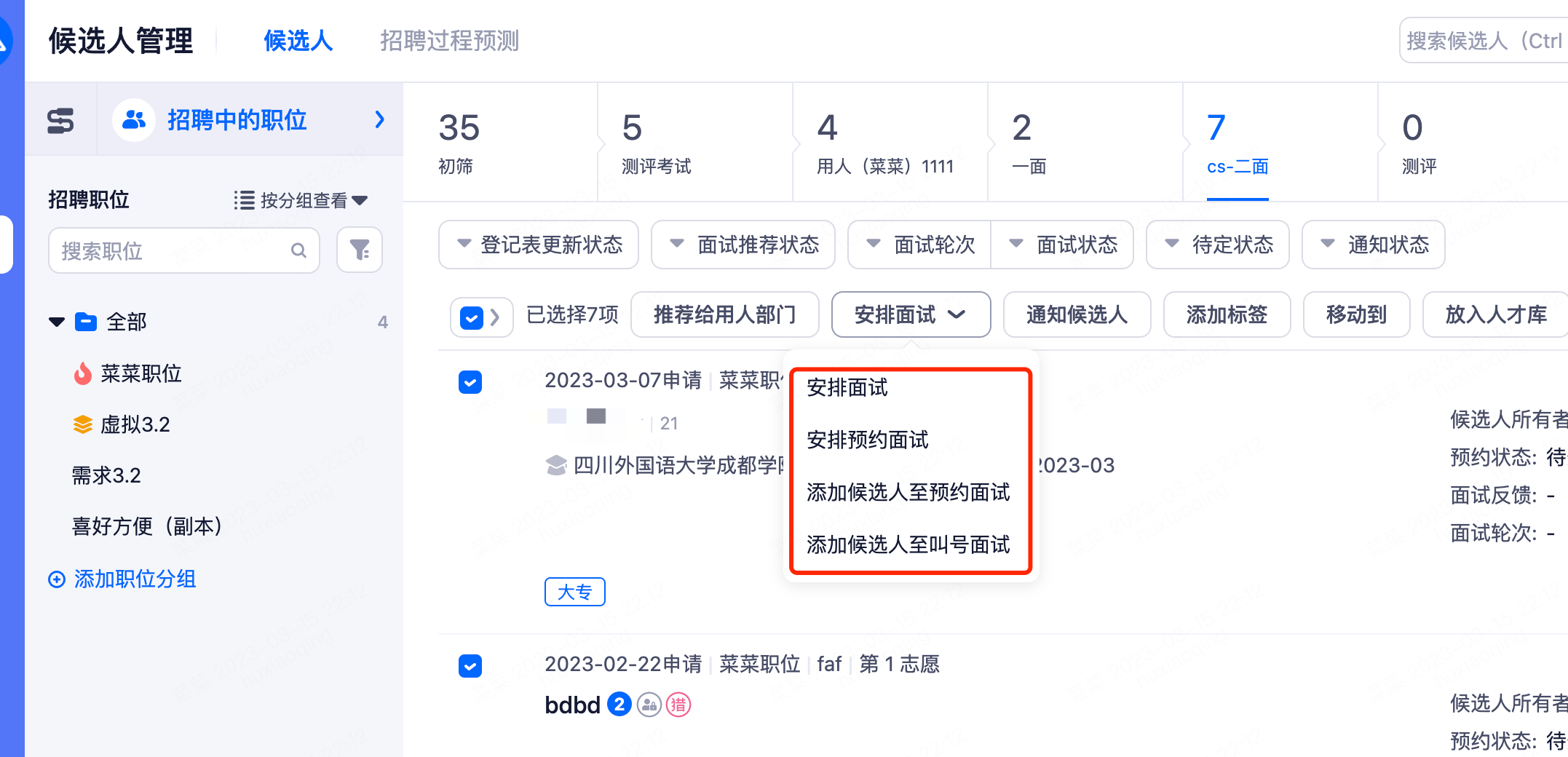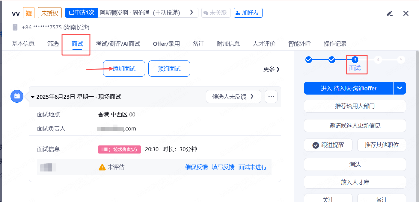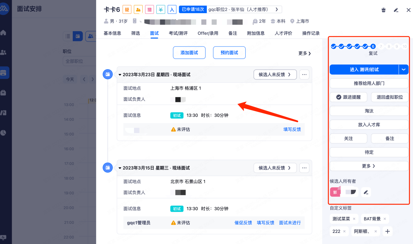 点击某个候选人可安排面试、查看面试情况、面试过程跟踪。
