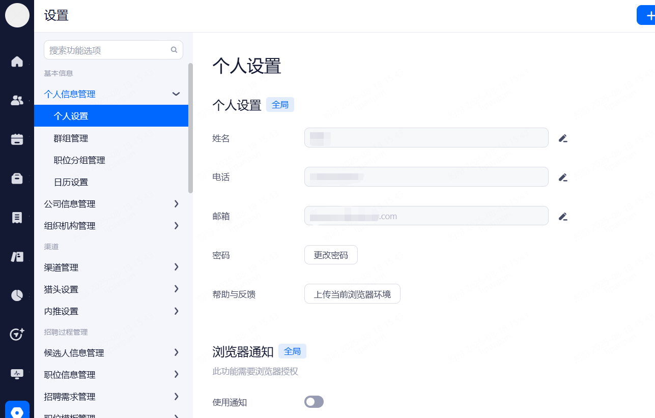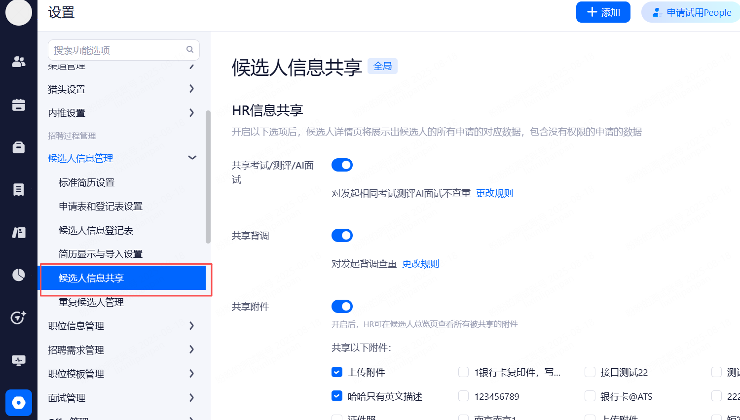 系统设置页面,在候选人信息管理中,您可以使用“候选人申请数据共享”功能按钮。候选人申请了多个职位的情况下,系统支持共享测评/考试、背调信息、附件等,没有职位权限的HR也可以共享来自这个职位的相关信息。
