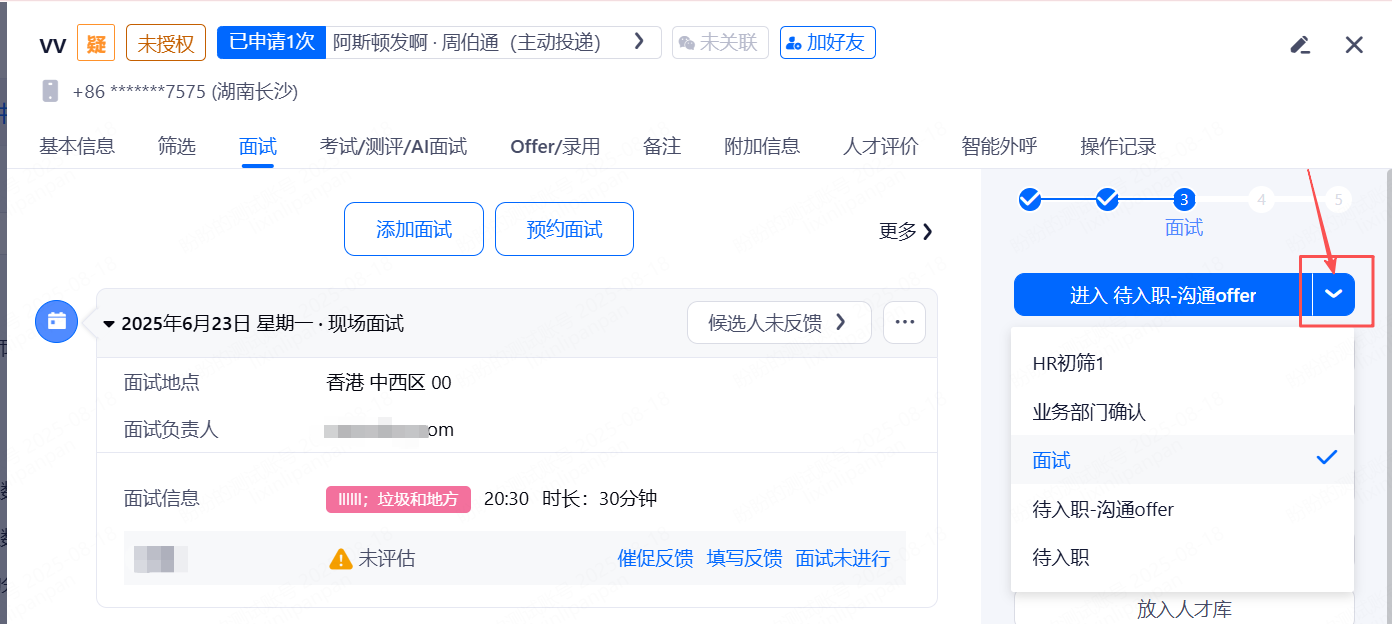 面试通过的简历可在简历详情右侧菜单选择进入其他阶段。
