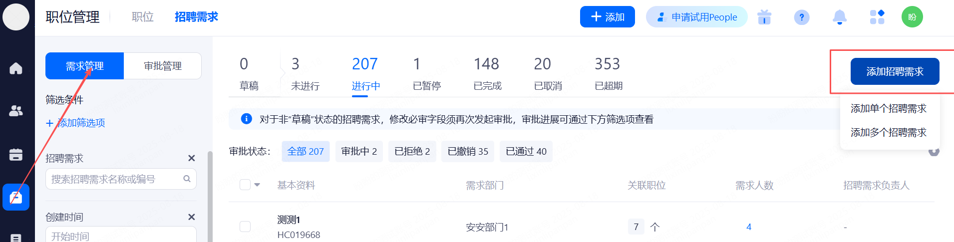 HR根据实际业务需求维护HC需求。在“职位管理”的页面左上角选择“招聘需求”,可选择单个添加或者多个批量上传的方式。