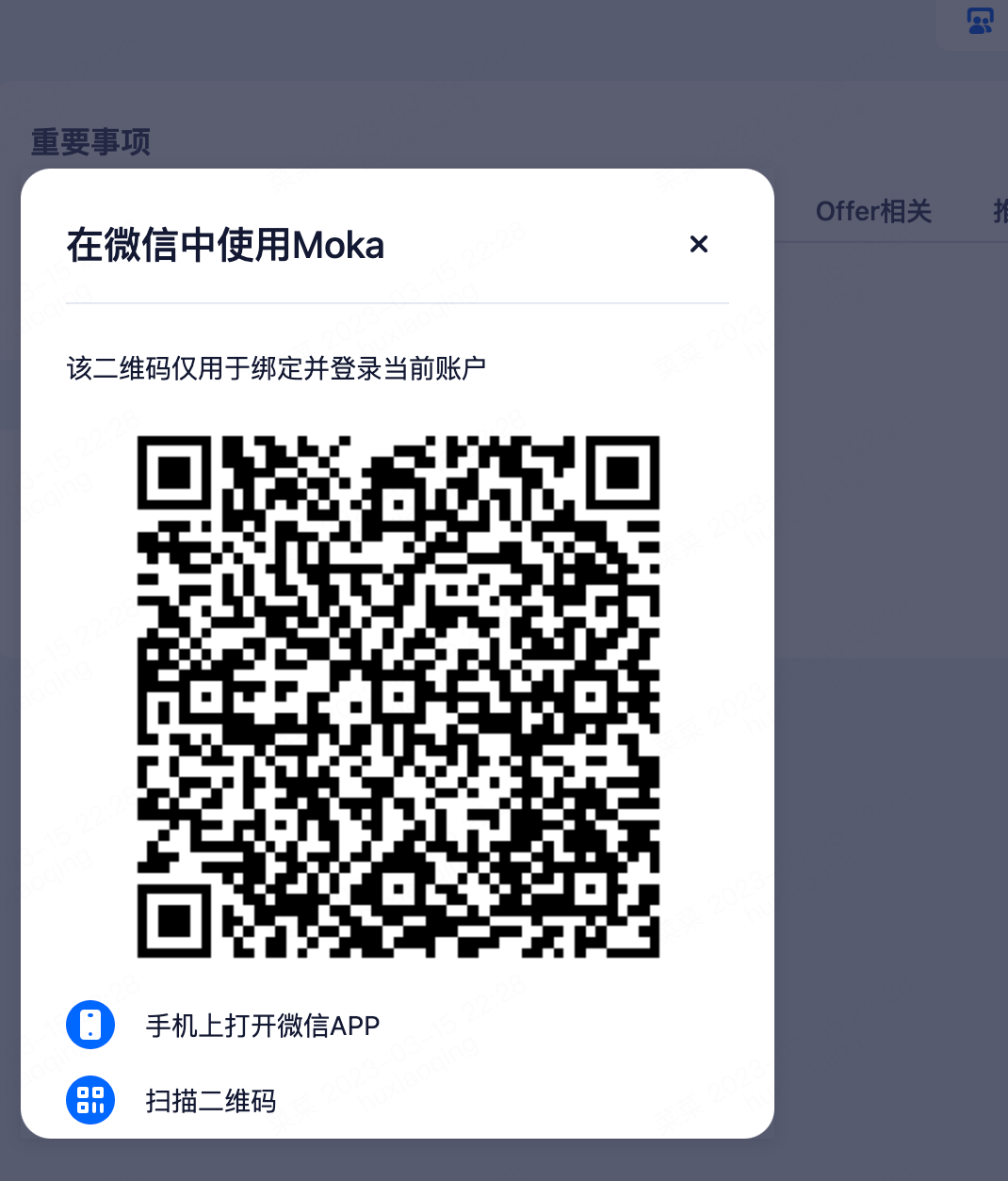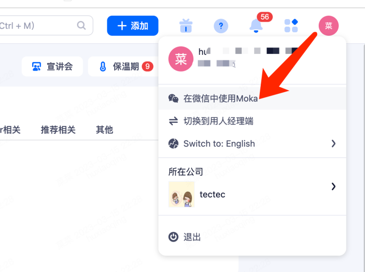 (2)登录系统后将鼠标放在系统右上方的头像图标上,在展开的菜单中点击 “在微信中使用Moka”,将弹出微信绑定二维码,使用微信进行扫码绑定即可。若已进行过绑定,扫码后会进入到“Moka招聘助手”公众号内。