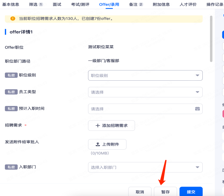 • 创建Offer:填写对应Offer审批字段,保存后可在该页面预览Offer详情及通知(创建offer只能是在offer类型阶段下可以进行创建,其他阶段是不支持的)